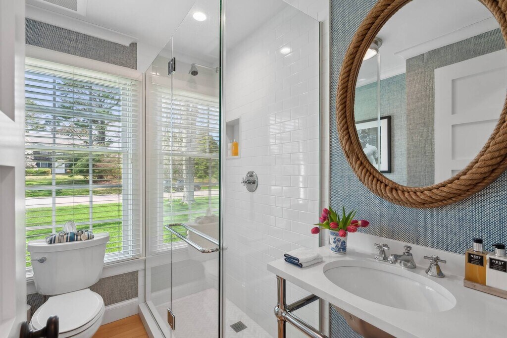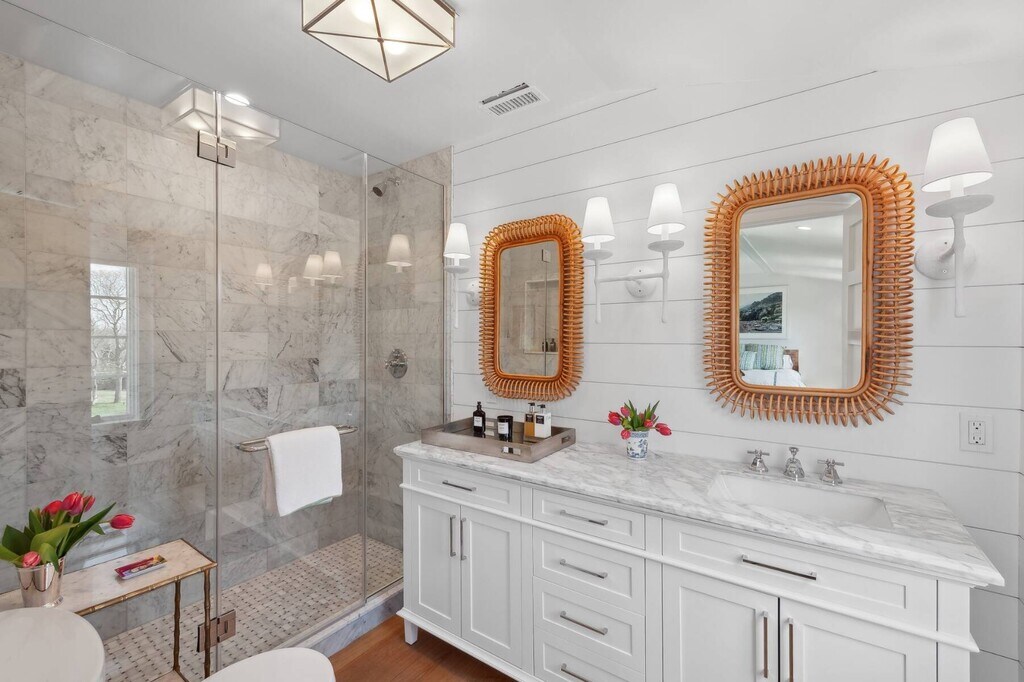 This designer ultra chic and spacious house with large grounds was just completed and is available for the first time. It is a classic Hampton Shingle completely reinvented into a very stylish home in absolutely pristine condition. Ideally located at the end of a quiet lane with cul de sac, this sun-filled house is also on the fringe of Southampton Village, giving one easy access to the main town while minimizing the usual traffic. There is a spectacular great room with vaulted ceiling and fireplace which makes for impressive entertaining. There is a Dutch door on one side and also a row of French doors which open to the unusually expansive back yard with heated pool and lovely planting. This gracious room flows seamlessly into the large kitchen and dinning room. All has been expertly designed and executed with brand new top appliances and cabinetry. There is a charming den/bedroom with full bathroom on the main floor. Upstairs, there are three spacious and bright bedrooms each with ensuite bathrooms and beautiful decor. Washer and dryer units are conveniently located on both the second floor as well as in the lower level basement. Outside, there are various sitting and dinning areas, including an allée of trees all surrounding the heated pool, vibrant lawns and specimen plantings and trees. This is a turn key sublime retreat in absolutely mint condition, and a rare to find close to coveted ocean beaches and the famous Village of Southampton with its world class restaurants and shops. [[Rental Registration # Pending]] Rental Terms: June/July: $105,000 July: $50,000 August - Labor Day: $68,000 June: $55,000 Memorial Day - Labor Day: $170,000 August: $60,000