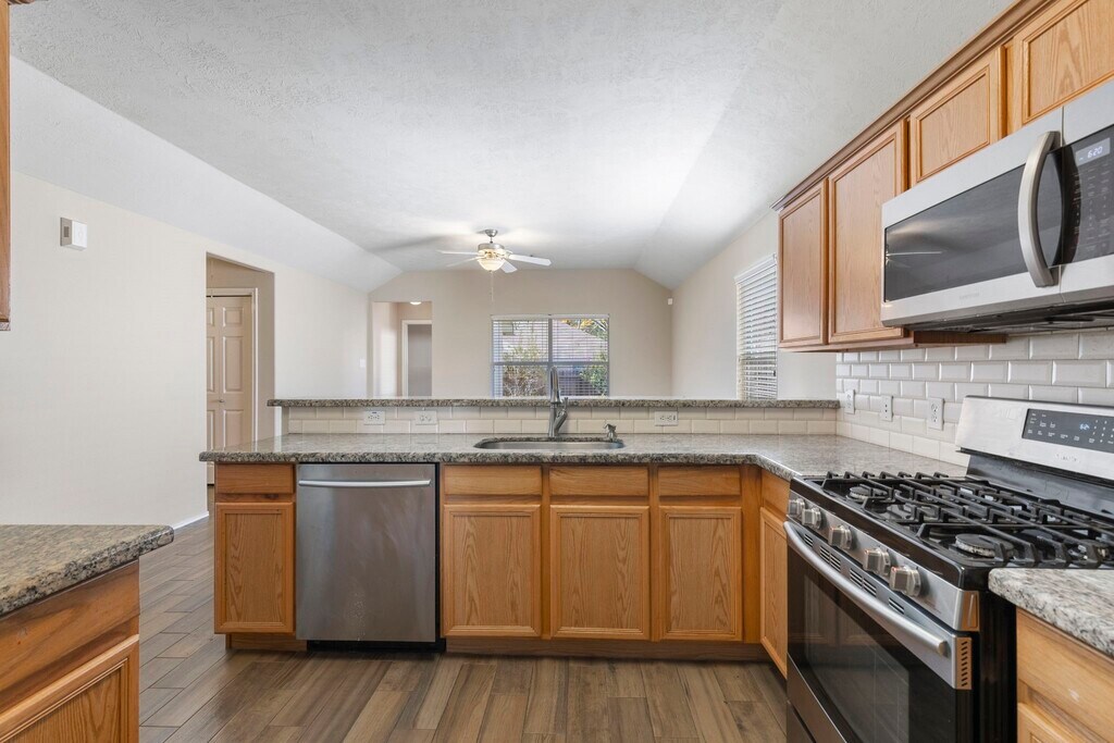 Beautiful single story home located on a cul de sac lot with open kitchen and living spaces. This three-bedroom,two-bath home features spacious bedrooms and closets. The kitchen provides granite countertops,stainless steel appliances,subway tile backsplash and a farmhouse sink open to the sizable den. Additional features include wood-like tile floors,a covered back patio and lawn care every other week. This home is in close proximity to pool and park with and has easy access to I-45. Bi-weekly yard service,refrigerator,clothes washer and clothes dryer included. MLS# 79899129