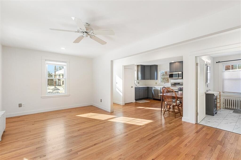 Charming two-level townhouse-style two bedroom with vintage details in walkable Warren Rhode Island,located downtown between Water and Main Streets. Five minute walk to Burr's Hill Park to watch the sunset or enjoy dinner at many local restaurants. If you do enjoy cooking,a renovated kitchen with new appliances (including dishwasher) and cabinets is at the ready in the open floor plan on the first level which also features dining and living areas and a full bath with shower and laundry (washer and dryer). Upstairs the bedrooms are big and bright with plenty of windows,two closets and an additional full bath with shower and skylight. Also upstairs is a cedar closet and additional storage and a den/office area. The second bedroom is just off of the additional upstairs area. Enjoy a large,private yard with deck off living room and paved off-street parking for 2 cars. Freshly painted with refinished hardwood floors throughout. Will consider one small dog. Heat,hotwater and electricity included MLS ID 1404241