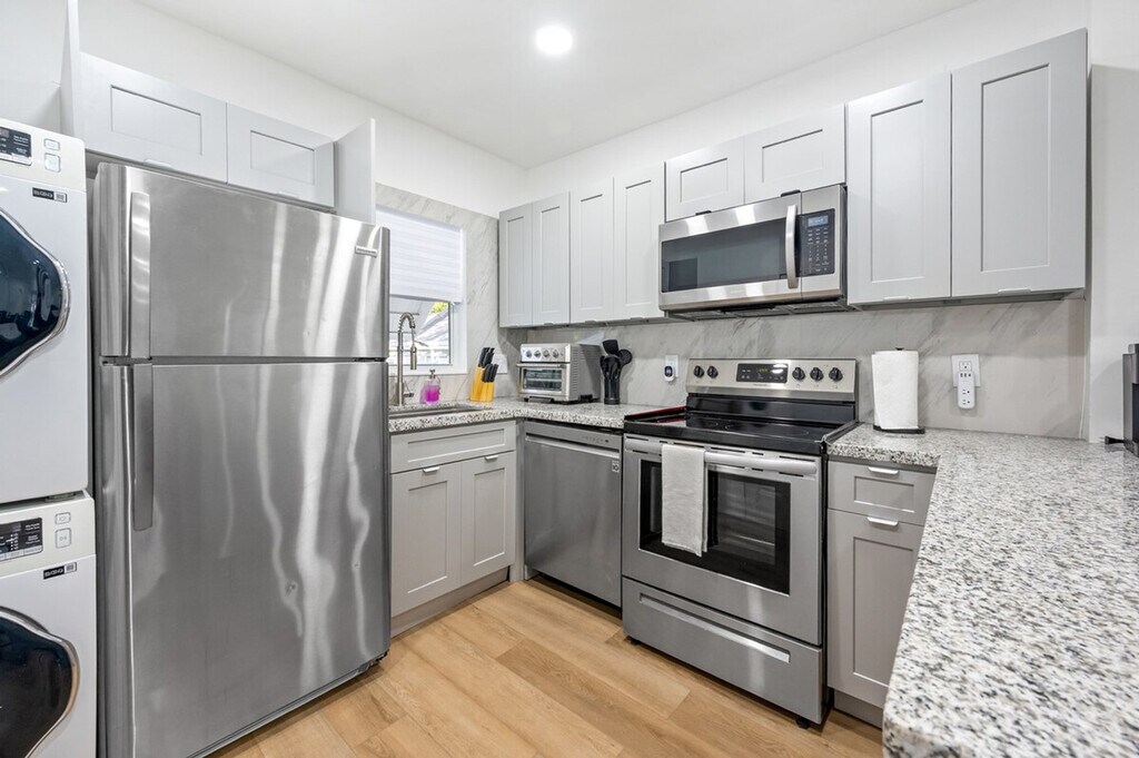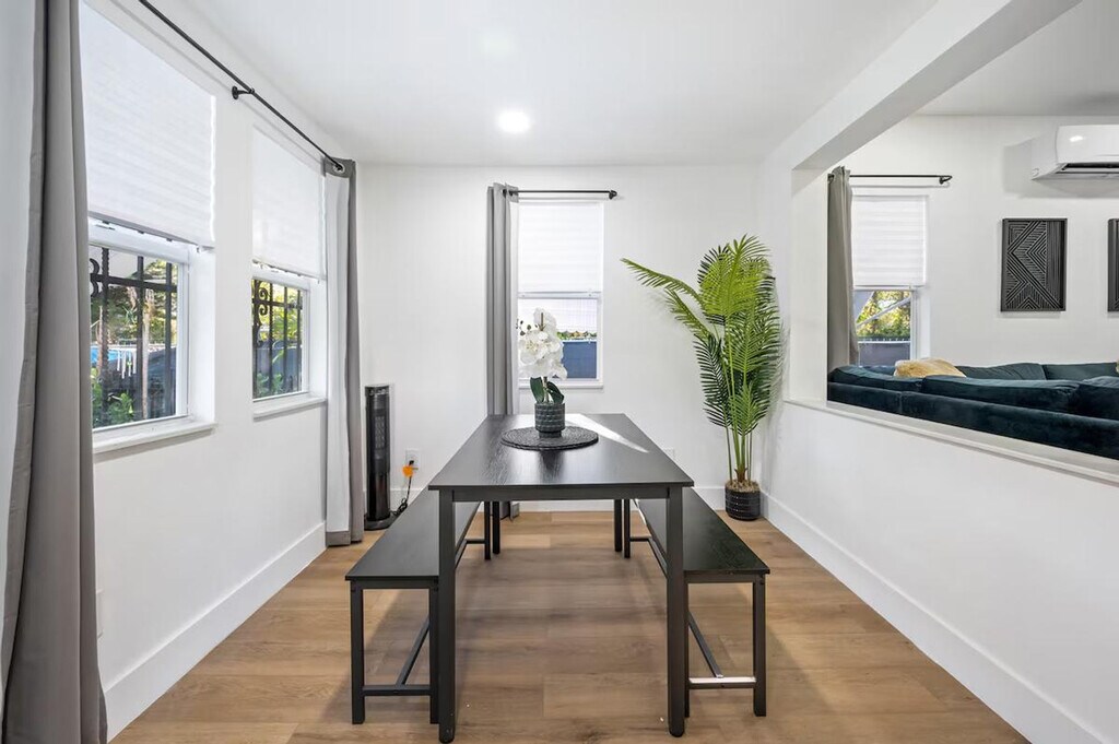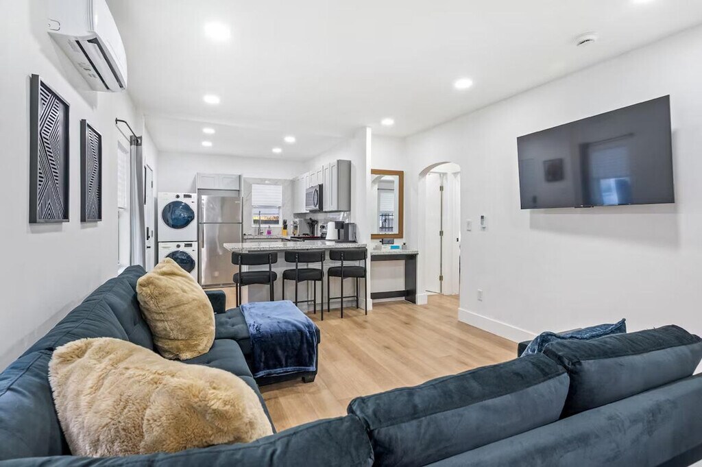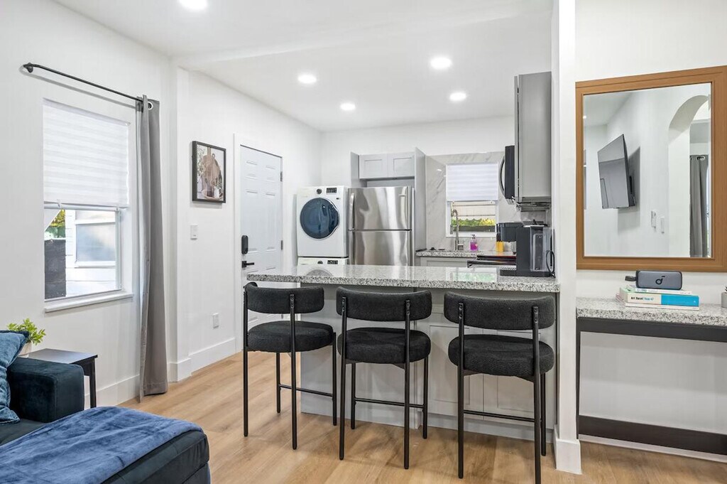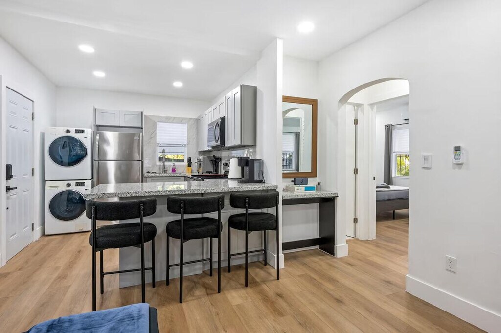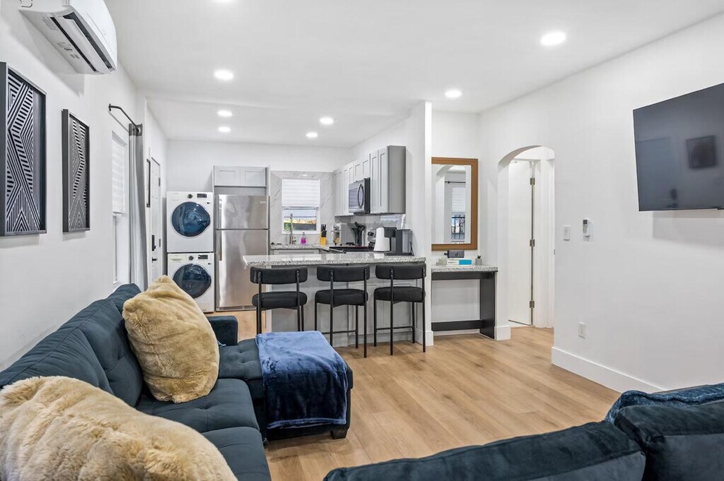 Feel at home in this modern and fresh 2-bedroom apartment, located north of the Design District in Miami. This apartment comfortably hosts up to 4 guests. Casa Magic comes equipped with everything you will need to enjoy your time, including a fully stocked kitchen with stainless steel appliances, air fryer, oven, stove, washer/dryer, coffee maker and Keurig k-cup coffee maker with pods, toaster, dishes, glasses, and mugs for up to 5 guests. The beautiful living room features a 55" smart TV with YoutubeTV, Netflix, Hulu, Pandora, and many other apps installed, as well as a modular soft sofa that converts into a pullout sofa bed. There is also a cozy dining area and a full bathroom with a luxurious rain showerhead, shampoo, soap, and towels to accommodate up to 5 people. Relax and enjoy the spacious outdoor area, including an outdoor table. Gated parking on rocks can accommodate up to 1 vehicle, plus there is street parking available. Interior driveway parking provides safety and security. Located north of Miami Design District, this apartment is 7 minutes to Wynwood, Design District, and Midtown, 15 minutes to South Beach, 10 minutes to MIA airport, and 12 minutes to Brickell. The property has a separated and private 1-bedroom house that is a mid-term rental, but it's separate and private from this main house. Your rental is 100% private with its own private entrance and private backyard space. The apartment features smart, keyless entry for easy check-in/check-out. There is a security camera system on the exterior of the home for additional peace of mind during your stay.