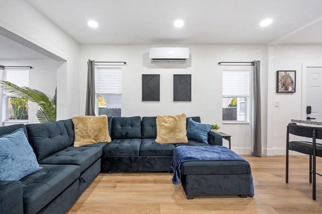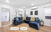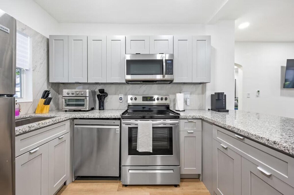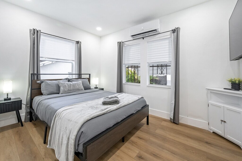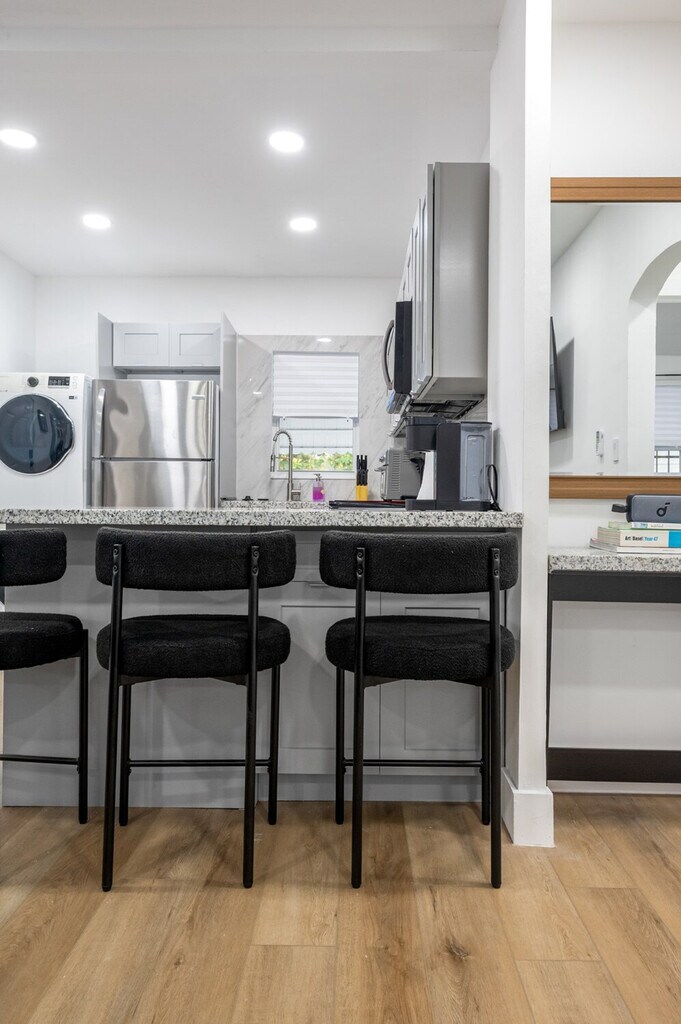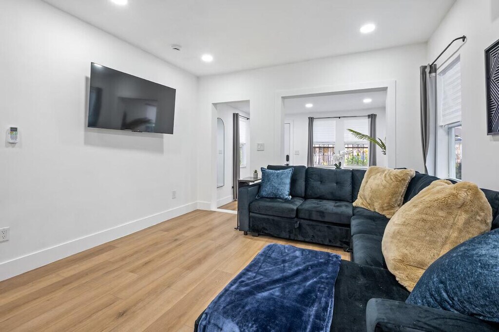 Feel at home in this modern and fresh 2-bedroom apartment, located north of the Design District in Miami. This apartment comfortably hosts up to 4 guests. Casa Magic comes equipped with everything you will need to enjoy your time, including a fully stocked kitchen with stainless steel appliances, air fryer, oven, stove, washer/dryer, coffee maker and Keurig k-cup coffee maker with pods, toaster, dishes, glasses, and mugs for up to 5 guests. The beautiful living room features a 55" smart TV with YoutubeTV, Netflix, Hulu, Pandora, and many other apps installed, as well as a modular soft sofa that converts into a pullout sofa bed. There is also a cozy dining area and a full bathroom with a luxurious rain showerhead, shampoo, soap, and towels to accommodate up to 5 people. Relax and enjoy the spacious outdoor area, including an outdoor table. Gated parking on rocks can accommodate up to 1 vehicle, plus there is street parking available. Interior driveway parking provides safety and security. Located north of Miami Design District, this apartment is 7 minutes to Wynwood, Design District, and Midtown, 15 minutes to South Beach, 10 minutes to MIA airport, and 12 minutes to Brickell. The property has a separated and private 1-bedroom house that is a mid-term rental, but it's separate and private from this main house. Your rental is 100% private with its own private entrance and private backyard space. The apartment features smart, keyless entry for easy check-in/check-out. There is a security camera system on the exterior of the home for additional peace of mind during your stay.