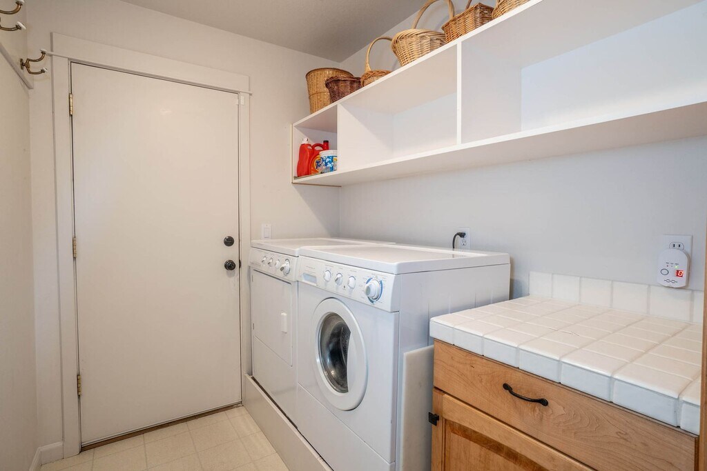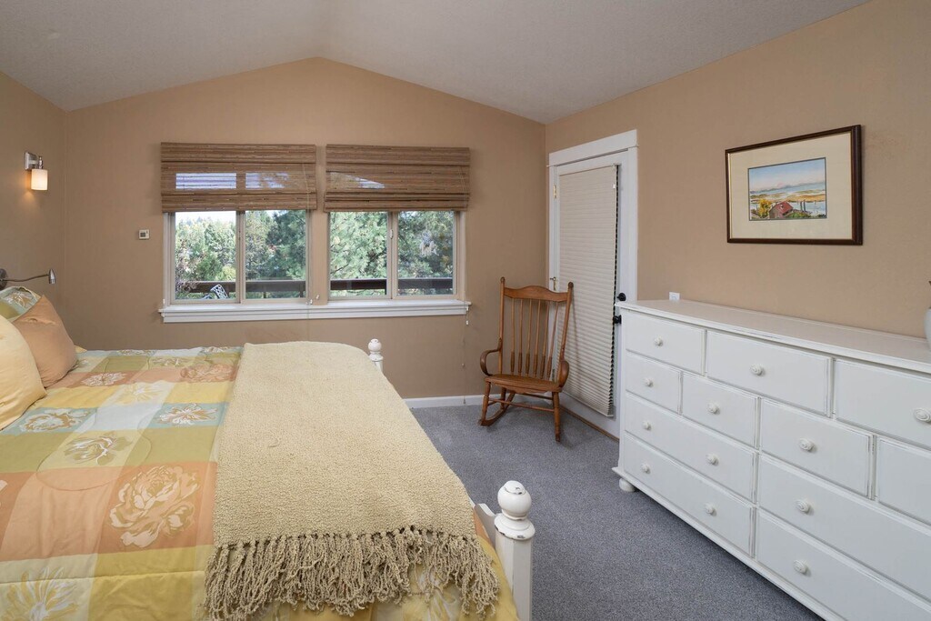 Furnished Monthly Rental, includes all utilities. The upper level of the main home, this beautiful private unit is located on the Deschutes River, and across from the 14h fairway. There is a large deck overlooking the river. Parking included in the 2-car garage, no street parking. River access is nearby on the public access trails (no private access). This home includes an full kitchen, a washer and dryer, and a two queen bedrooms, and two bathrooms. Refinished hardwood floor and carpeted bedroom. Sorry, no pets. In a spectacular central location close to shopping and downtown. Just a 5 minute walk to Currents Restaurant at the Riverhouse where they serve breakfast, lunch, and dinner with seating on the river and have weekly live entertainment for free. Easy access to the parkway makes driving to downtown and The Old Mill super easy and quick. The Bend River Mall is a 2 minute drive. The view from the deck is of the river and the river wildlife--great blue herons, ducks, canadian geese, otters and more. Ceiling fans Remote fireplace Central heating Desk/Workspace 2-car garage access Washer/Dryer Full kitchen with stainless appliances Smart TV/Wi-Fi in living room and 2nd bedroom