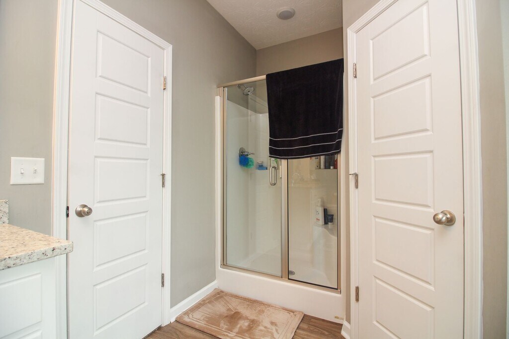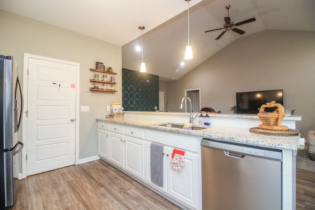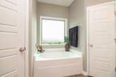 Open floor plan, view of living room and dining area from kitchen Master Bedroom suite has soaking tub, separate shower, double vanity, double walk in closet and private privy large privacy fenced yard