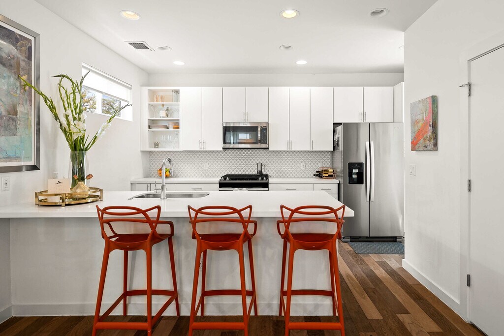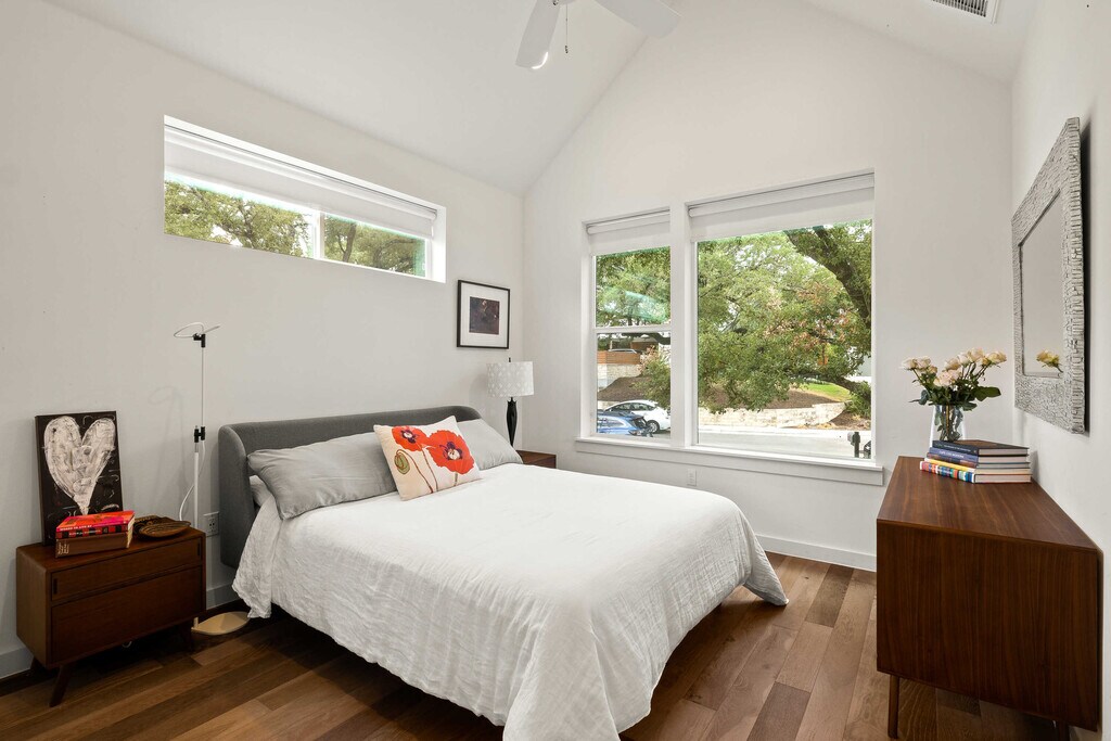 For Lease! High-end lock-and-leave lease in hip South Austin that is offered furnished or unfurnished. Available now. Situated in the heart of Austin’s coveted, boutique 78704 neighborhood, this modern, well-maintained, energy-efficient house lives like new, sits on a gorgeous tree-lined street just 3 miles from downtown and comes with high-end furnishings. Thoughtfully designed for modern city dwellers, this stand-alone turn-key home boasts a bright, open first-floor plan with 2 large bedrooms + bathrooms on the second floor. Both the 1st and 2nd floors have high, vaulted ceilings, bringing more breathability to an already spacious design. The lower level includes a quaint flex space for a micro-office and/or additional storage. The main-floor living area features large windows overlooking the front yard’s amazing oak trees. The elegance of this home’s living space continues outdoors to the fenced front yard, complete with a covered concrete patio, designated grilling area, full irrigation system + lush landscaping. Because this street is not a through street, it remains quiet and friendly with ample capacity for guest street parking. The attached garage holds one vehicle with additional reserved parking spaces in the driveway in the rear. The HOA maintains all exterior pest control, mowing + landscaping, making this home an easy lock and leave. This home includes like-new appliances and high-end finishes: washer and dryer, stainless steel kitchen appliances including a gas range, dishwasher + side-by-side refrigerator. Originally built in 2017 with a 5-Star Green rating, utilities are kept low with energy-saving features, including fully-owned solar panels, tankless water heater, spray foam insulation, and an electric car plug-in. Located minutes from downtown Austin, South Congress, S. Lamar, and all the other conveniences of central Austin. The home feeds to award-winning Zilker Elementary, is a 5-minute walk to Tom Lasseter Neighborhood Park + a 10-minute drive to Barton Springs. Pets Negotiable.