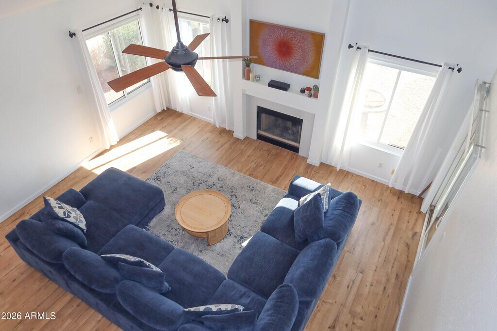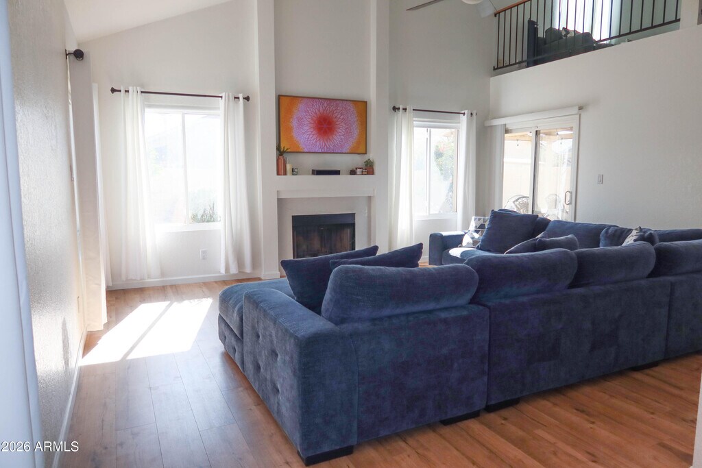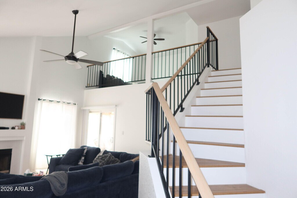 Amazing rental home with dramatic soaring ceilings,warm interior palette,blinds and curtains,rich wood flooring and upgraded lighting. A unique curved staircase leads to the second level,adding architectural character. Enjoy the gorgeous quartz wrapped fireplace,ceiling fans throughout,and Arcadia doors opening to the patio. The stunning eat-in kitchen features a gorgeous quartz water fall countertops and quartz back splash,newer appliances,and beautiful shaker cabinetry the perfect gathering space for family and friends. This meticulously maintained home is truly move-in ready. Upstairs loft offers endless possibilities for a home office,media space,or play area. Generously sized bedrooms provide ample closet space and comfort.
