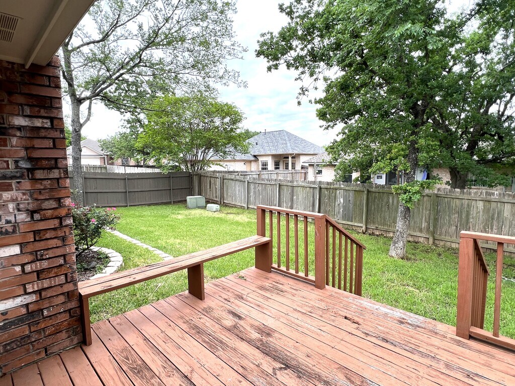 HAVE YOU BEEN LOOKING FOR THE CUTEST THREE BEDROOM HOUSE WITH A YARD AND A GARAGE IN A QUIET NEIGHBORHOOD??? This one is for you!!! AVAILABLE FOR MOVE IN ON 7/12/2026. CLOSE IN TO COLLEGE STATION SHOPPING AND RESTAURANTS. VERY CUTE 3 bed 2 bath with a 2 car garage. Slate tiled entry, Raised cathedral ceilings in the large family room centered on a gas fireplace with multitudes of LARGE windows allowing tons of natural light! Outside find a great privacy fenced back yard with a sun deck, and lawn maintenance done for you!!!! Great eating alcove off of the family room, again with wonderful windows and open to the kitchen. Kitchen has beautiful cabinetry - some with glass fronts, window over the kitchen sink allows views and additional natural sunlight, raised tray ceiling, and pass through to light bright family and breakfast areas and range and micro have been recently replaced with updated stainless steel appliances. Utility room connections only. Extra large primary bedroom with trayed ceiling up to 10' in height, and private seating area overlooking the back yard. Separate stand up shower and jetted soaking tub in Primary bath, finished off with tons of linen storage and huge master closet. Two more bedrooms, again with ceilings over ten ft in ht. Close to Texas Avenue so no Highway 6 commute congestion. Owner requires tenants to maintain rental insurance policy during duration of lease. Please note: Renters Insurance Verification is required before move in. All pets are approved on individual basis. Cute, cute 3 bed 2 bath with 2 car garage. Slate tiled entry with glass storm door. Raised cathedral ceilings in the large family room with fireplace and multitudes of large windows allowing tons of natural light! Great eating alcove off of the family room and open to the kitchen. Kitchen has beautiful cabinetry - some with glass fronts, window over the kitchen sink, raised tray ceiling, and pass through to light bright family and breakfast areas. Also includes the refrigerator. Utility room connections only but does have gas connection as well as electric for dryer. Extra large primary bedroom with trayed ceiling up to 10' in height, bayed seating area. Separate stand up shower and jetted soaking tub in Primary bath. Two more bedrooms, again with ceilings over ten ft in ht. Large wood deck with seating, as well as covered porch area in the back. Quiet area close to Texas Avenue and shopping, restaurants, etc. Owner provides landscape maintenance.