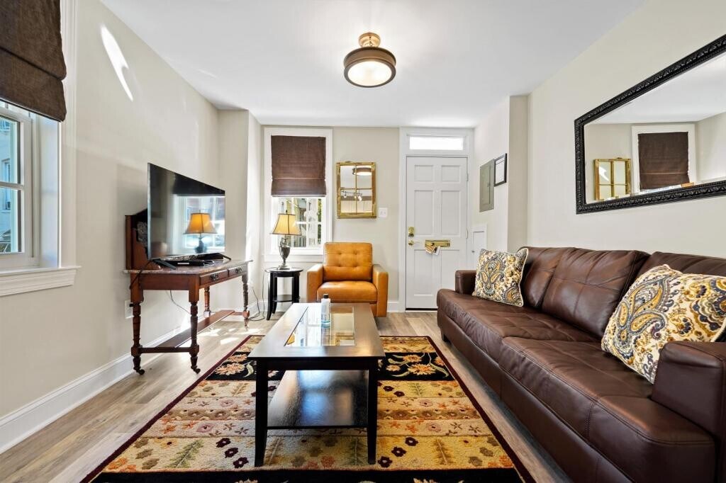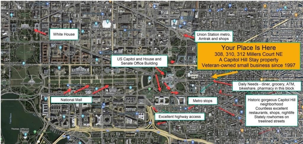 FULLY FURNISHED CAN BE SHORT TERM ALL UTILITIES INCLUDED. 31 day minimum. Capitol Hill Stay is a veteran owned small business providing monthly and fully furnished short term lodging on Capitol Hill since 1997. We have two dozen places. Please contact us for more info. This is a two story carriage house, not an apartment. It makes for a very private furnished housing experience, whether short-term or extended stay. The layout is open and flexible. The private backyard patio is great for well-behaved pets. Built around 1860 and tons of historic character. Millers Court carriage house row is directly off of the 300 block of East Capitol Street, three blocks to the Capitol. Fantastic location. First floor is open kitchen, dining, and living room. Queen sleeper sofa in living room. Private backyard patio (completely fenced, so perfect for a dog). Upstairs is an open bedroom with queen bed, great workspace area with desk, and large closet. Nicely tiled bath with tub/shower. Parking MAY be available directly in front (inquire about availability). Very few of these remain in DC due to many being torn down decades ago. Walk to groceries, Whole Foods, two metro stations, the U.S. Capitol, National Mall, and countless world class and neighborhood restaurants. See all of our places at