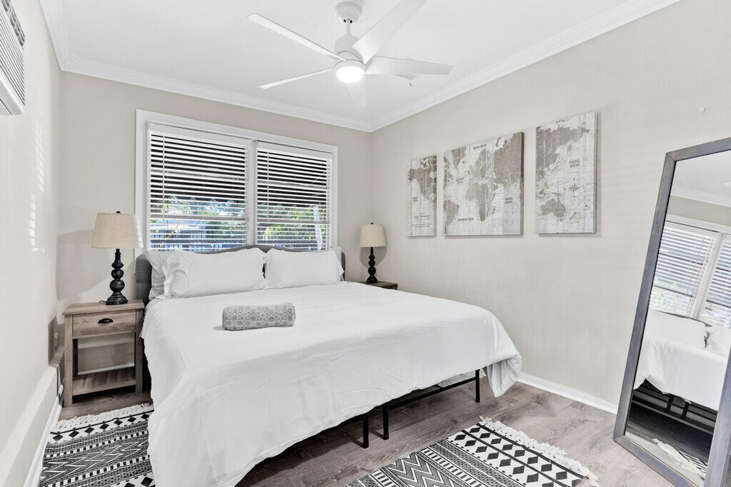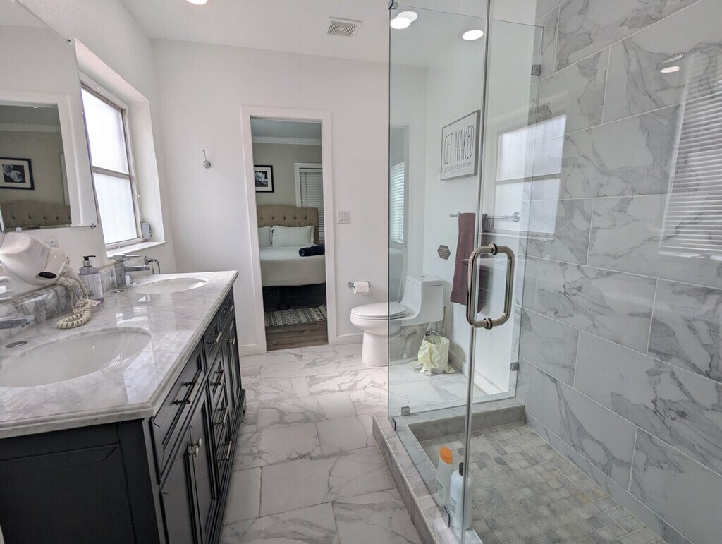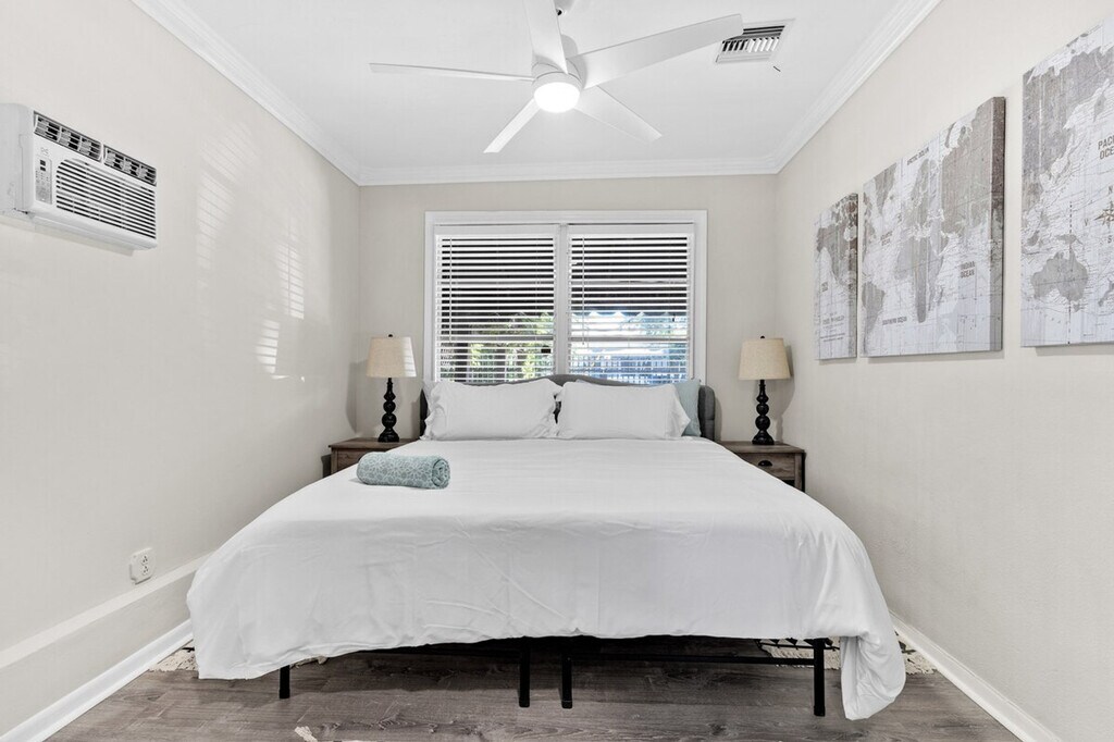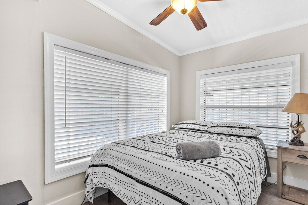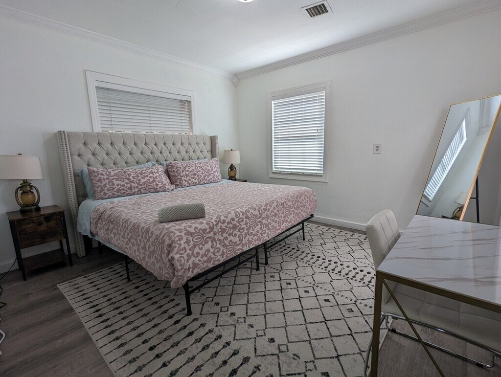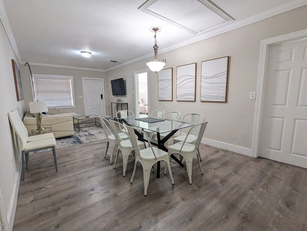 Feel at home in this cozy 4-bedroom, 3-bathroom home with modern updates and original charm. This home features a fully equipped kitchen, a spacious dining area for eight, and a relaxing living area with a 50-inch TV. Enjoy the hot tub, two king-size bedrooms, one with a luxury en-suite bathroom, another room with two queen beds, plus a full bed in a separate room. High-speed Wi-Fi completes the perfect getaway experience. Paid laundry facilities are available on the property. There are four studio units on the property occupied by long-term tenants. These units are completely separate from the main house, ensuring your privacy is maintained throughout your stay. Quiet hours are between 9 PM and 6 AM. This is a strictly non-smoking property, including all indoor areas and the hot tub vicinity. The home is not fully wheelchair accessible.