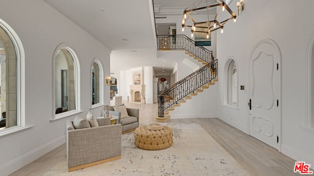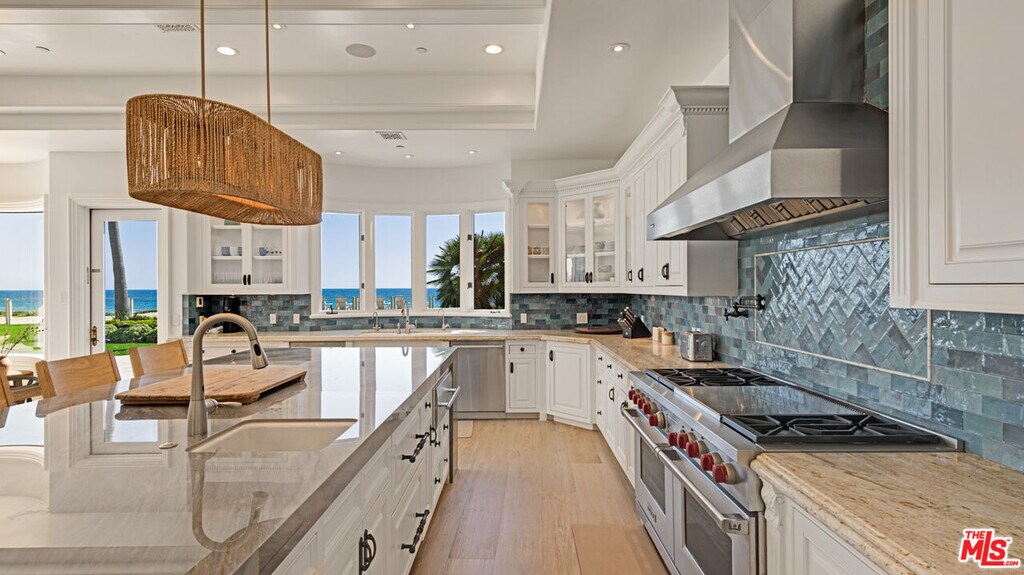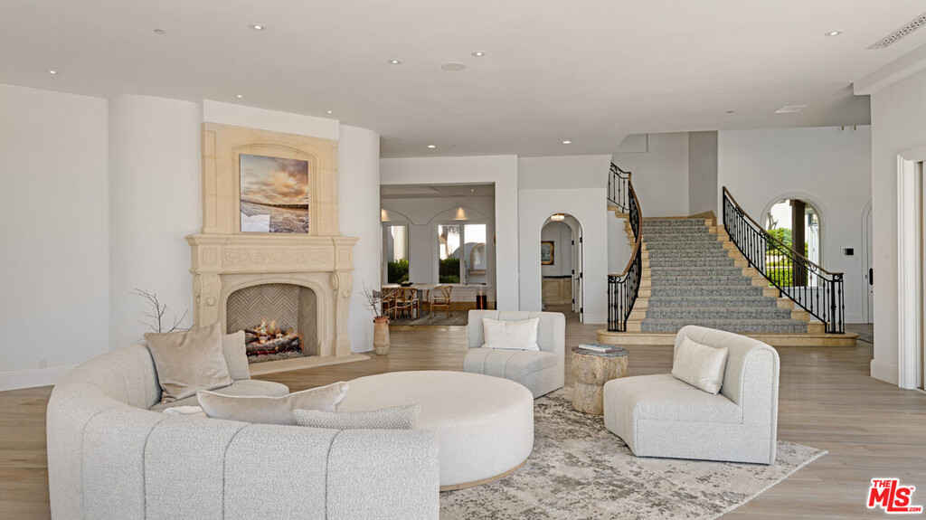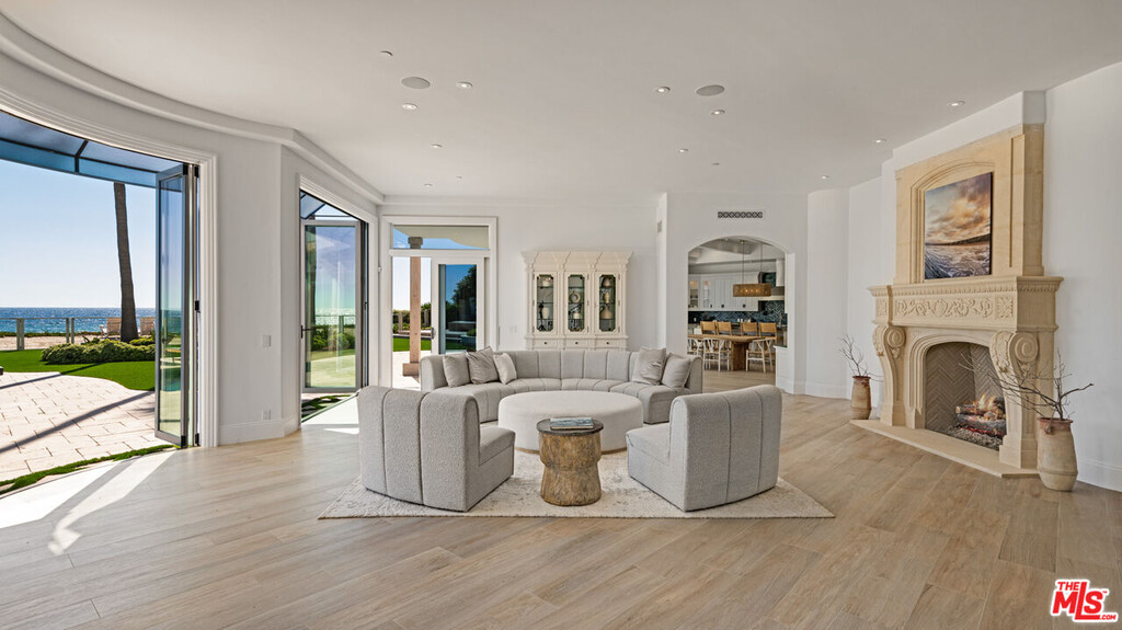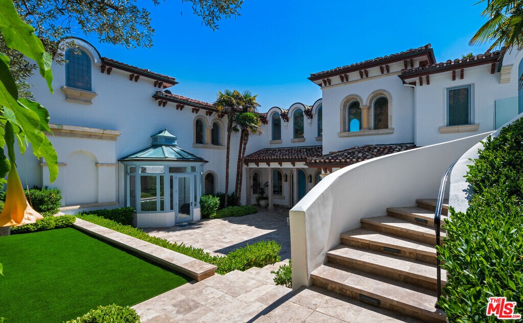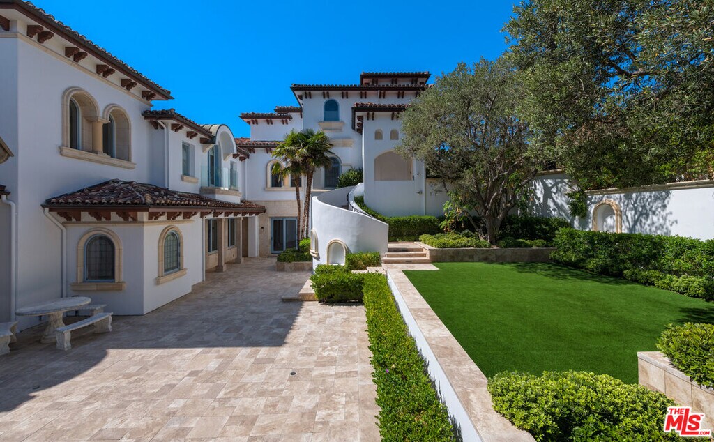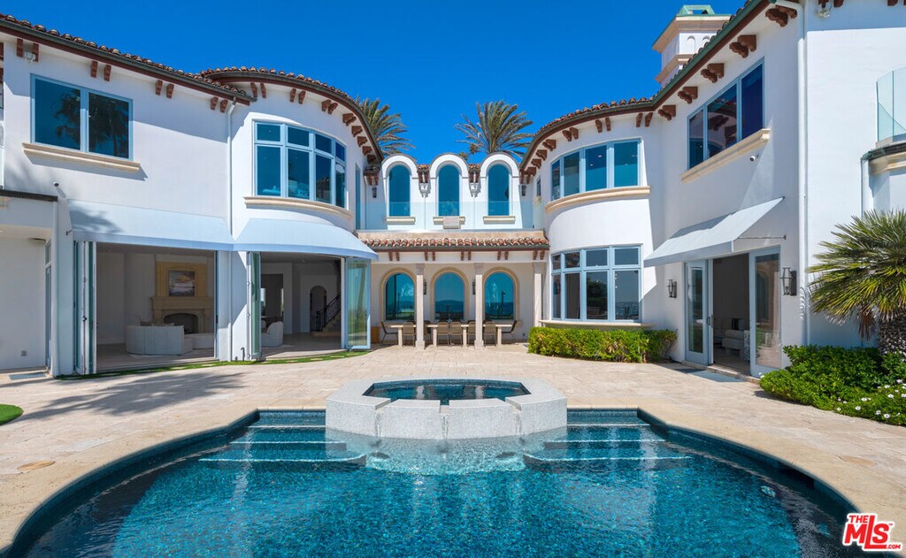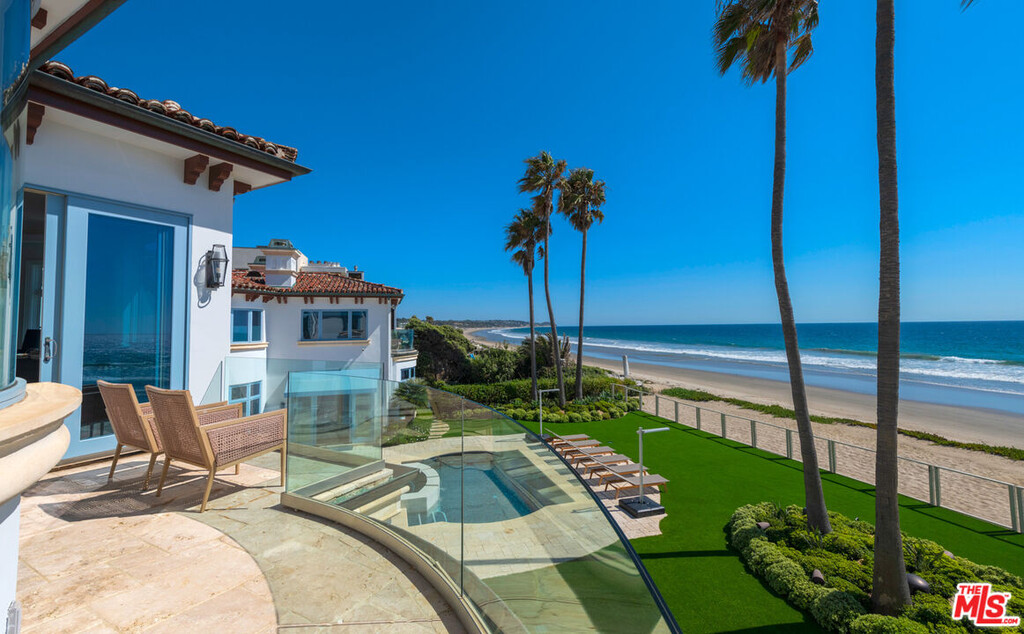 Luxury Estate with Ocean Views and Resort-Style Amenities. Nestled along the pristine shores of the Pacific Ocean, this magnificent luxury estate combines modern elegance with Spanish architecture. From its clay tile roof to the breathtaking resort-style courtyard and beyond, this property exemplifies the epitome of coastal living. As you step through the grand foyer's double doors, you're immediately greeted by sweeping ocean views. Tile floors and two-story ceilings adorned with a magnificent chandelier set the stage for the opulence that awaits. To the right of the foyer, there is a grand staircase and a spacious formal living room. High ceilings, built-in speakers, sliding glass doors to the beachside, and a large wood-burning fireplace create a welcoming atmosphere with panoramic ocean vistas. The dining room boasts stone tile floors, coffered ceilings, and French windows that fill the space with natural light. A butler's pantry with stone counters and a Sub-Zero wine fridge connects to the dining area. The kitchen, accessible from the dining room, features tile floors, a dining area with a TV, a built-in desk with a blue backsplash, and a large island with waterfall stone counters. High-end appliances, ocean views, and a hidden Sub-Zero fridge and freezer complete this culinary paradise. A carpeted hallway leads to an elegant office with coffered ceilings, stone tile floors, and a serene courtyard view. Next door, you'll find a full bathroom with stone tile floors, stone counters, a vanity, and a shower stall. A hallway elevator enhances accessibility. The entertainment wing features a large family room with stone tile floors, coffered ceilings, a fireplace, a wet bar, and sliding glass doors leading to the backyard. A movie theater awaits just two steps up from the hallway, equipped with carpet floors, blue abstract walls, sectional seating, and built-ins for concessions. The gym, with stone tile floors, skylights, and a sunroom ambiance, includes a TV, stone counters with built-ins, and a closet with water toy storage. Upstairs, the master suite boasts panoramic ocean views, a massive sitting area, a fireplace, and access to a balcony. The master bath features stone tile floors, double sinks, a jetted tub, a spacious shower, and two water closets. Two generous closets with built-ins provide ample storage. Additional bedrooms include ensuites, including a second master Oceanside, closets, and balconies with courtyard or ocean views. The backyard is an entertainer's dream, with a pool, spa, covered dining area, outdoor kitchen, fire pit, and direct access to your" low bluff just steps above the sand and sea. Lush landscaping, large palm trees, and outdoor cameras complete this coastal paradise. Experience luxury coastal living at its finest in this exquisite estate with captivating ocean views, lavish amenities, and unparalleled elegance." MLS# 25554307