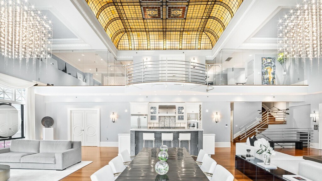 Stunning, one-of-a-kind corner loft at the Historic Jefferson Trust Bank building. Built in 1909 and placed on the National Register of Historic Places in 1986, this truly unique space has soaring 21 foot ceilings, 3180 SF of living space, 2 bedrooms plus den, 2.5 bathrooms, private keyed elevator access into the home and garage parking for one car. Designed for entertaining, the five 9.5 foot high windows with northern and western exposures saturate the great room with natural light. The original egg and dart plaster moldings and spectacular 400 square foot stained glass backlit skylight are significant examples of the historic architecture of the building and compliment the loft's scale and opulence. Open chef’s kitchen features Viking appliances, Carrara marble countertops and large island with breakfast bar. Both bedrooms have en suite bathrooms complimented by duel sinks, soaking tubs and showers. Second floor den provides the perfect home office or nursery. Half bath, laundry room, dark stained wide-plank solid oak hardwood floors, motorized window treatments, smart-lighting system, fire place and duel HVAC system round out this incredible home. Garage parking plus proximity to PATH, ferry, light rail and busses make commuting a breeze. Completely furnished including towels & linens, plates & glasses, pots & pans, cable/wifi & electric.