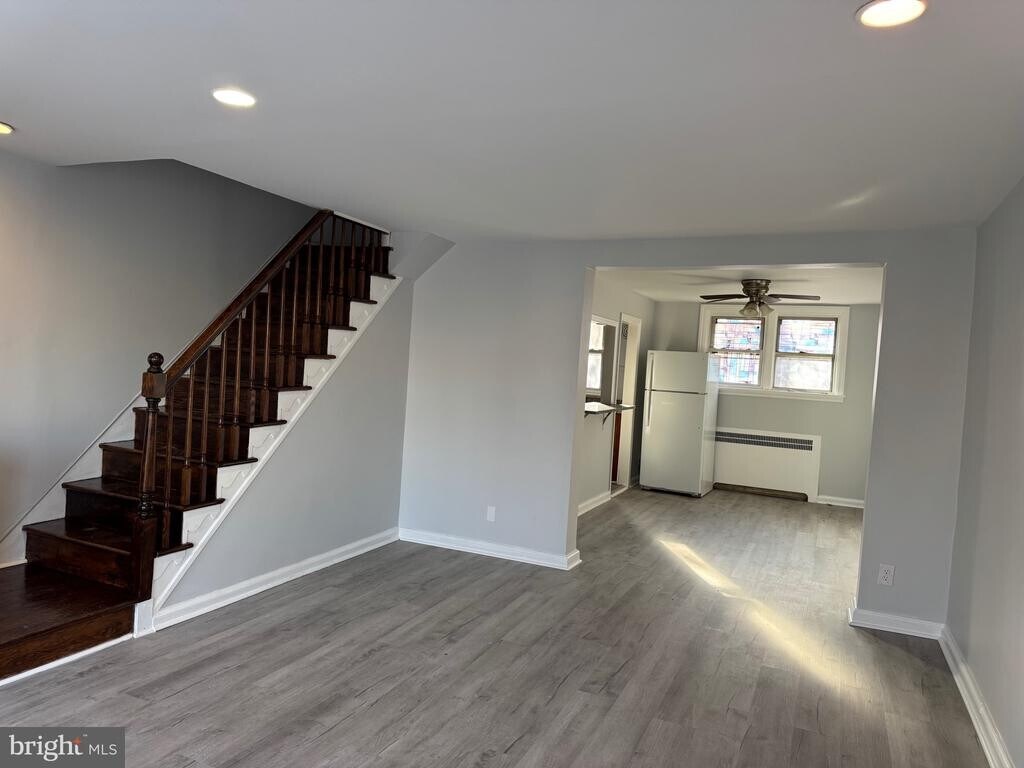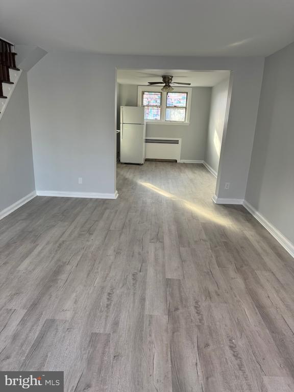 For Rent Nice townhouse recently renovated Enter into a bright living room with a bay window and recessed lighting. The dining room has a ceiling fan and a cut out to the kitchen. The kitchen has recessed lighting and a granite countertop. Use it for serving or add some stools making it a convenient way to sit down and enjoy a meal. granite countertop and to add a little modern touch, track lighting! The basement is partially finished which can be used as a playroom, office or that added room for TV viewing, just use your imagination. Laundry hookup in the basement. the a walkout and parking for one car as well as a one-car garage. Upstairs has 3 bedrooms. the master bedroom has a ceiling fan. The hall bath. hardwood floors throughout. Connivence location , close to 69th street train stations, buses, trolley, schools, libraries and shopping area.