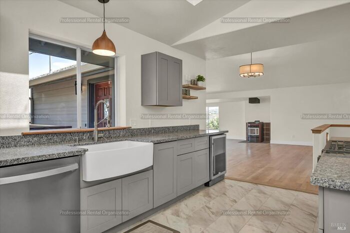 Welcome to the beautifully updated home in Pope Valley, CA, offering stunning views and modern amenities. This home features three spacious bedrooms and two updated bathrooms with stylish tile work. The open floor plan is sun-drenched, creating a bright and inviting atmosphere throughout the home. The large kitchen great room is equipped with stainless steel Whirlpool appliances, including a gas stove and built-in microwave, and a wine refrigerator, perfect for the wine enthusiast. The Carrera marble-style vinyl flooring in the kitchen contrasts beautifully with the light Oak hardwood flooring throughout the living area. The bedrooms are carpeted, adding a cozy touch. Freshly painted inside and out, this home is move-in ready. The expansive wrap-around deck off the entry-living room and master bedroom offers panoramic hillside valley views, showcasing Putah Creek and the dramatic palisades. You can also enjoy vistas of Guenoc-Langtry winery and vineyards in the distance. The oversized garage provides ample room for storage and a work area. Experience the perfect blend of natural beauty and modern convenience in this Pope Valley gem. Visit for additional information and/or viewing instructions through Agent DRE# 01396316 This property allows self guided viewing without an appointment. Contact for details.