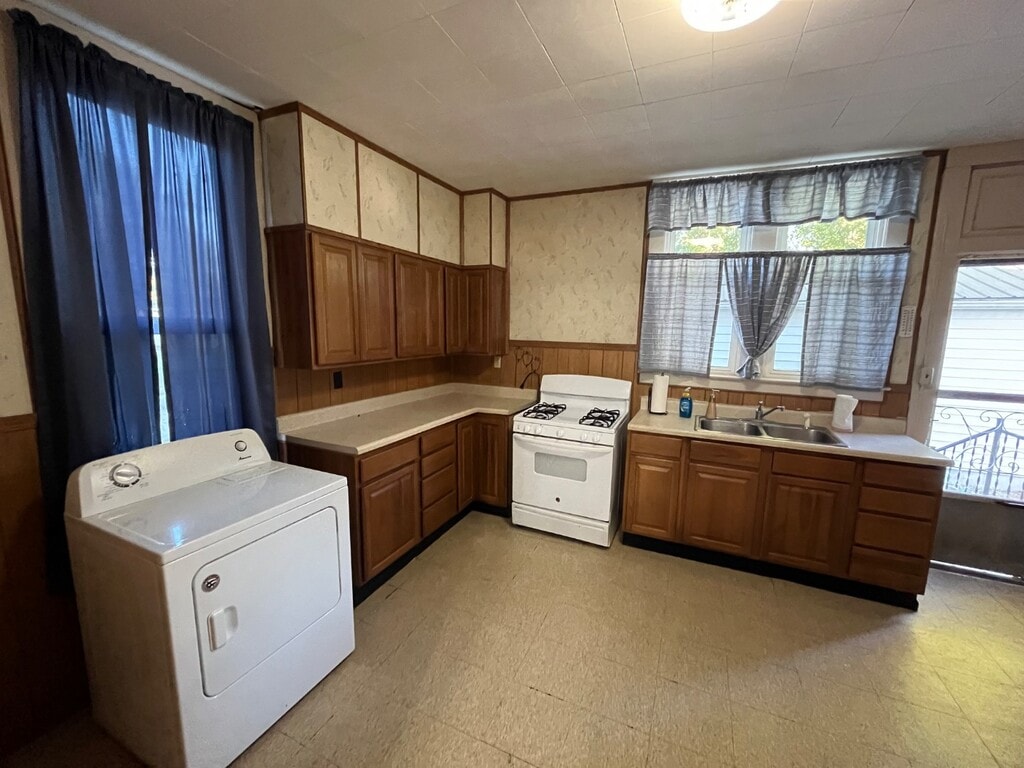 This three bedroom, one bathroom home features a formal dining room with built in storage. The kitchen comes equipped with a refrigerator, gas stove, washer and dryer. The home is located on a corner lot with a large fenced in yard. There is also a detached one car garage with a brand new garage door.
