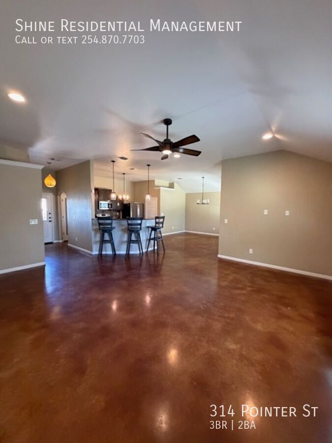 Welcome to Cedar Heights Estate, a stunning 3-bedroom, 2-bathroom home nestled in the heart of Nolanville, TX. This home boasts a plethora of amenities designed for comfort and style. The open-concept living/dining/kitchen area is perfect for entertaining, featuring recessed lighting, a kitchen bar, and dining area with hanging lights. The kitchen is a chef's dream with stainless appliances, upgraded granite countertops, and plenty of storage. The spacious master bedroom is a true retreat with a vaulted ceiling and an abundance of natural light. The master bathroom is equipped with dual sinks and a separate shower for added convenience. Additional features include ceiling fans, faux wood window blinds, and solar screens for energy efficiency. The stained concrete floors add a touch of elegance and are easy to maintain. The property is enclosed by a privacy fence, ensuring your peace and security. A stainless refrigerator completes the package, making Cedar Heights Estate a perfect blend of luxury and practicality. Dining Dual Master Bathroom Sinks Faux Wood Window Blinds Hanging Lights In Dining And Kitchen Kitchen Bar Kitchen Bar Open Concept Living/Dining/Kitchen Area Plenty Of Natural Light Plenty Of Storage Privacy Fence Recessed Lighting Seperate Shower Solar Screens Spacious Master Bedroom With Vaulted Ceiling Stained Concrete Floors Stainless Appliances Stainless Refrigerator Upgraded Granite Countertops