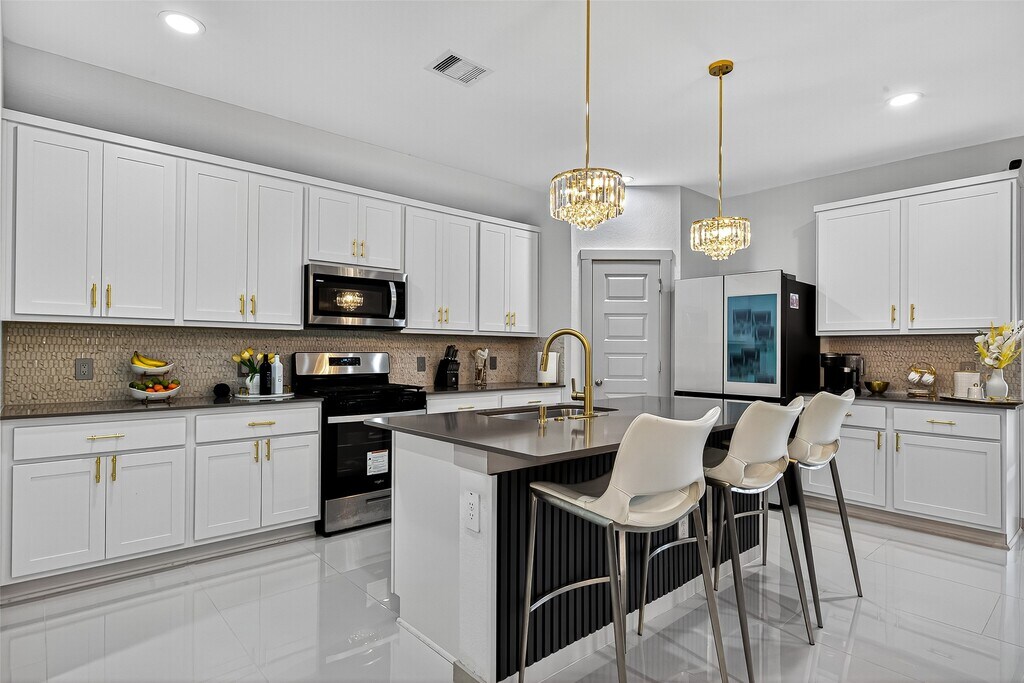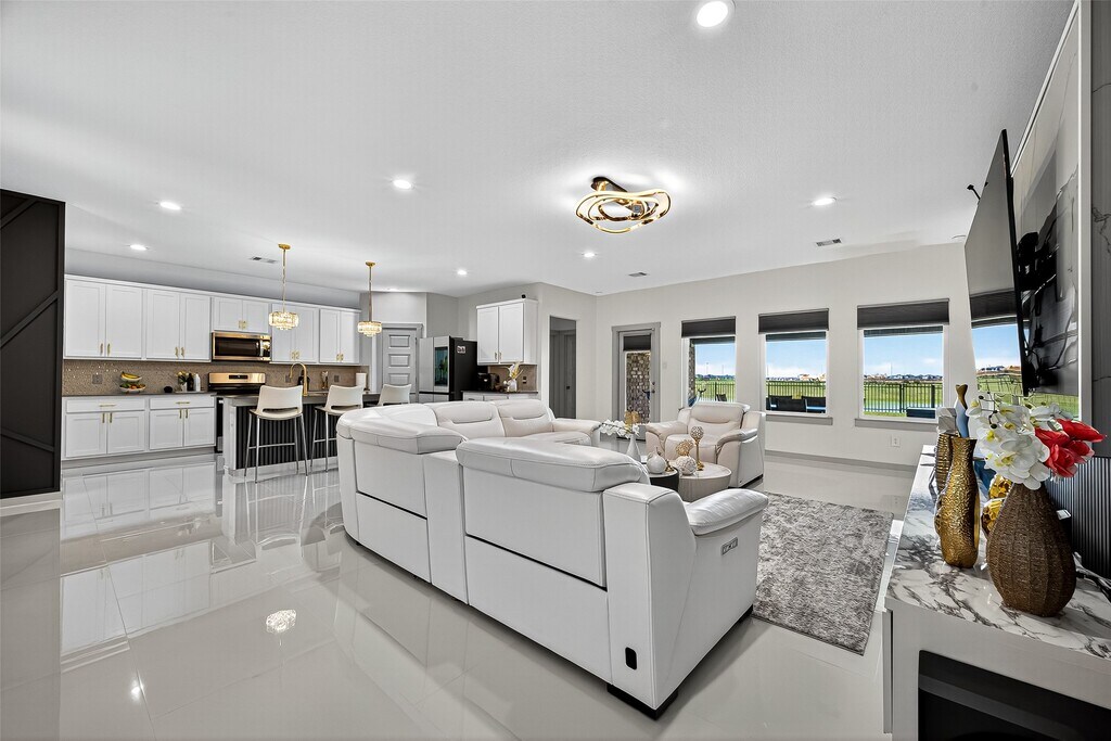 Like New with Stunning Lake Views!This single-story gem offers 5 bedrooms,3 bathrooms,and a study,with a spacious living space. As you step into the foyer,you’ll find a hallway to your left leading to three secondary bedrooms and a full bathroom. Open-concept dining room,family room,and kitchen create the perfect space for gatherings. The kitchen features: Large island open to the family room — perfect for entertaining.Quartz countertops. White cabinets,Stainless steel appliances. The large family room is filled with natural light and overlooks the covered patio with a lake view. The study/home office with a imponent glass door. Secondary bedroom with its own bathroom. The main bedroom an oversized shower in the ensuite bath. Porcelain tile floors & luxury finishes,Amazing Refrigerator. No back neighbors,Modern,bright kitchen,Spectacular lake views. Amenities: Parks,walking trails,pickleball courts,splash pad,fitness center,soccer fields,lakes,and pool. MLS# 53344384