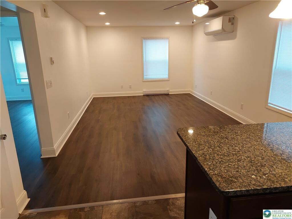 Modern apartment with open floor plan, large living/family room, kitchen and laundry. 2 large bedrooms with walk-in closets. Excellent condition. 1 modern bath. Hardwood type laminate flooring. Granite countertops. Newer appliances, W/D, dishwasher. Each room has ceiling fans. Electric baseboard heat augmented by efficient wall mounted heat/AC pump unit. 2nd Floor. No Smoking. No Pets. Convenient off-street parking in private lot. Tenant pays electric, cable, phone, garbage. Landlord pays water and sewer. Great location, close to downtown Bethlehem, casino, shopping and restaurants, with easy access to 378, 33, 78, 22. Owner is a licensed Realtor.