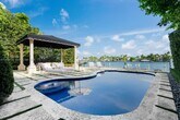 This waterfront home on San Marino offers the hard to find 6 bedrooms on the Venetians Islands. Featuring marble and wood flooring, wall paneling, and beachy chic furnishings. Water views are afforded to the social areas and the sizable kitchen complete with a Viking 6 burner cooktop, white marble counters + eat-in island, Subzero refrigeration & wine wall as well as sliding glass for privacy. Entertain from 3 distinct areas - the living room, fireplace room, and waterfront dining setting. The primary suite spans the full Eastern position with an expansive dressing room and private terrace. Arrive home to your elegant brick driveway past privacy hedges. The East facing backyard with breezes off the ocean offers a mosaic-tiled pool, canopy covered dining table, & dock.
