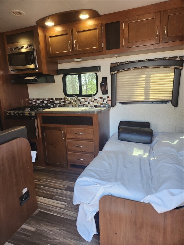 Short term vacation rental camper or long term flexible rental camper located next to the house. The house is being renovated. The camper is available now. Its a 2017 jayco camper that is 23 feet long. Has the bed and the sofa futon plus dining table and kitchen.