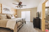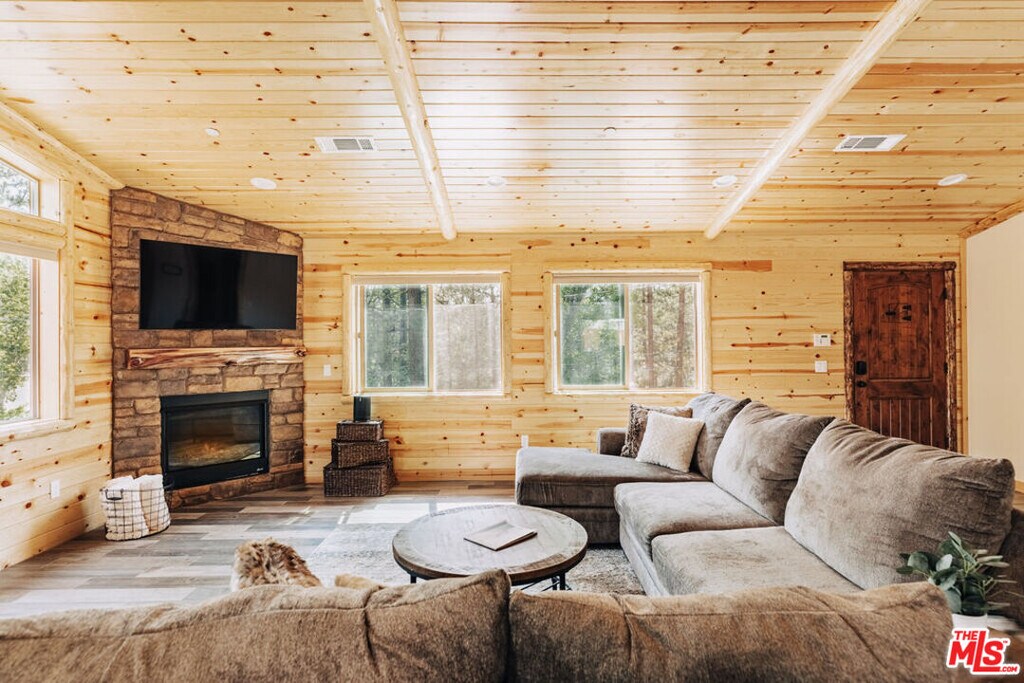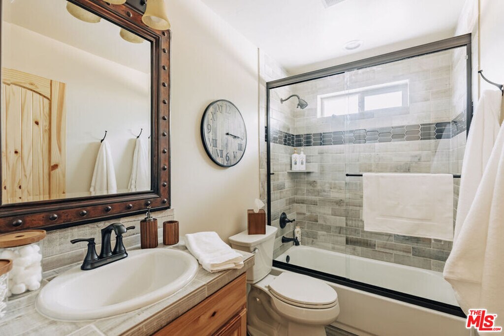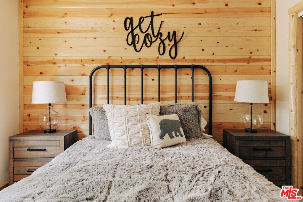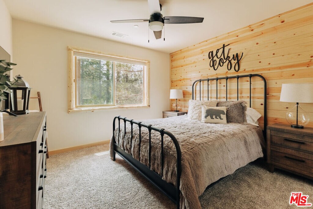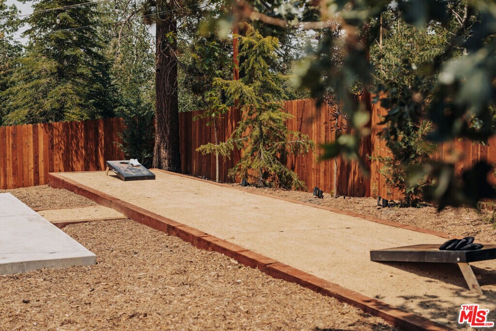 This home is relatively new and comes fully furnished with stainless steel appliances, bedding, kitchen supplies, etc. The great room has a large sectional that has a queen size pull out sofa bed. There is a gas burning fireplace, a 60 inch smart tv, and a large wifi blue tooth speaker that can be used to listen to your favorite playlist. The cabin comes with a variety of board games and card games. The beautiful kitchen comes equipped with a refrigerator with filtered water, dishwasher, microwave, Keurig coffee maker, toaster, blender, and crockpot. It provides serving for twelve and professional grade Viking pots and pans for all the chefs that visit our home. The master bedroom offers a king size bed, 40 inch smart tv, walk in closet, connecting bathroom, and slider that accesses the backyard. One of the guest rooms has a queen size bed and the other guest room has a full bunkbed with a twin on top and a twin trundle underneath. Both of these bedrooms also have 40 inch smart tv's. The great room and all the bedrooms have ceiling fans. Both bathrooms have a tub/shower combo and come supplied with shampoo, conditioner, body wash, plenty of towels, and there is a blow dryer in each. In the hallway, there is a full washer and dryer that can be used throughout your stay. Our recently completed backyard has an outdoor picnic style dining table, hot tub that seats seven, gas BBQ, large fire pit, and a gaming court to play corn hole and bocce ball (both of which are provided). The cabin is centrally located to many Big Bear activities & attractions! MLS ID 26779035