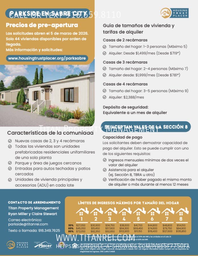 Grand Opening Reduced Rents!! Monthly Rent Range: $1,999.00-$2,232.00 +Monthly Resident Benefits Program: $39.00 To schedule a showing please click the schedule showing button if available now or contact our leasing team at . Please visit to schedule showing or APPLY NOW. Brand New manufactured home in the new affordable housing community, Parkside at Sabre City in West Roseville! These primary homes are three bedroom, two bathroom units with one covered carport space. Each home has modern finishes with laminate vinyl plank flooring throughout, nice size kitchen with modern cabinets, solid surface counter, stainless steel appliances and sink, and garbage disposal. Homes have a laundry room with washer and dryer. All appliances are electric with stove has an induction cooktop which are energy efficient and very safe to use; they do require use of only cast iron pans. All homes have fenced backyard with bark landscaping for easy upkeep; tenants must maintain private yards and may not change landscaping. One assigned covered carport space directly next to unit and then street parking for any additional vehicles or guests as shared driveways may not be used for parking. Community is built right Sabre City Park maintained by Placer County. 3D Virtual Tour: Pet Policy: Pets negotiable for fully qualified applicants with pet application and management approval, and additional pet addendum required. No more than two small to midsize household pets that are nonaggressive and don't exceed 50 pounds. All pets must be licensed, vaccinated, and profile created and maintained throughout tenancy. Subject to additional terms upon approval. Renter's Insurance Required: All approved applicants will be required to carry Renters Insurance throughout their Tenancy. Utilities paid by Tenant directly: SMUD (Electric) Fidium (Internet) *Homes are prewired with Fidium Fiber Internet and Tenant needs to activate and pay. Fidium modem will include phone jack if landline is preferred as well. Utilities paid by Owner: water, sewer, & garbage. Resident Benefits Program: $39/month This listing is part of an affordable housing program. Household incomes must not exceed the limits published on the website (not to exceed 80% of AMI) based on household size. All household income must be included with this application. Submitting an application does not guarantee a lease and rent rates and AMI limitations will vary by unit. Households must remain income-qualified during tenancy. Income will be verified prior to move-in and re-certified annually at lease renewal. PLEASE READ BEFORE SUBMITTING APPLICATION: Titan Property Management will enforce occupancy standards that establish the minimum and maximum number of household members allowed per home. Household size includes all full-time members listed on the application, including temporarily absent members, children anticipated to live in the home, students away at school, live-in aides, and foster children or adults. Household size must be appropriate for the home and any verified special needs. In general, maximum occupancy is two persons per bedroom, plus one additional person. Titan Property Management will begin accepting applications for homes at this new community. Applications are accepted on a first-come, first-served basis. Any Resident 18 years of age or older who intends to reside at the property or stay more than 3 days per month must apply and pay a $50.00 application fee. The application fee is required from each applicant as a processing fee to verify income, credit, and eviction history. *The $50.00 application fee is non-refundable once the application processing has begun. Applications are processed as received and the first completed application that is fully qualified (meets all the rental criteria listed below) is approved. We accept payment for processing online by credit card at the time you apply. Required Documentation for Application verification process: 1. Proof of Identification: Valid photo ID (Required) & Social Security Card (If available) 2. Proof of Income: Bank connect or upload last two pay stubs and most recent bank statement. 3. Current and Previous Landlord references must be submitted on application for verification purposes. We require current and previous Landlord reference for each Applicant so if Applicants have different Landlords they will each be required to submit. **Addresses provided are matched to credit report and Ownership is pulled through Title to verify accuracy. Landlord phone number and email required. 4. link will be sent after application is submitted to verify your animal(s) or confirmation if no animals. Profile fee only applies to applicants with a pet (waived for emotional support animals, service animals, and applicants with no pets). No pets allowed without written consent of Owner or Agent and if approved additional Pet Rent will apply. As per SB 276, having a housing voucher gives you the ability to use alternative documentation other than a credit report to qualify for this home. Since you have already furnished us with the alternative documentation we will begin processing your application. We will still run a credit report to confirm identity and search for any unlawful detainer actions, bankruptcies or foreclosures but your credit score/history will not factor into our decision to approve you for the home. We will also confirm your rental history with your previous landlords. *Please note any information incorrectly entered on an application requiring re-running the application will require an additional $50.00 application fee and your written authorization so please double check your social, date of birth and previous addresses. Thank you! RENTAL REQUIREMENTS (PLEASE READ CAREFULLY) 1. Completed application with all required documentation for each adult 18 years of age or older 2. Valid Government issued photo ID (i.e. driver’s license or passport) 3. Application fee of $50.00 per adult applicant 4. N