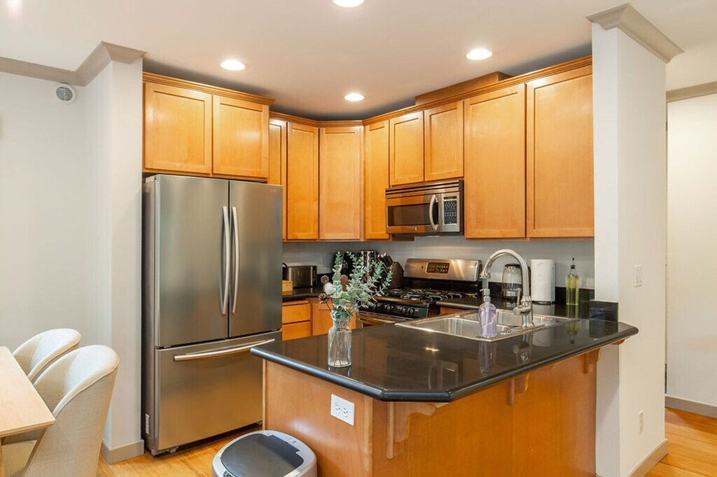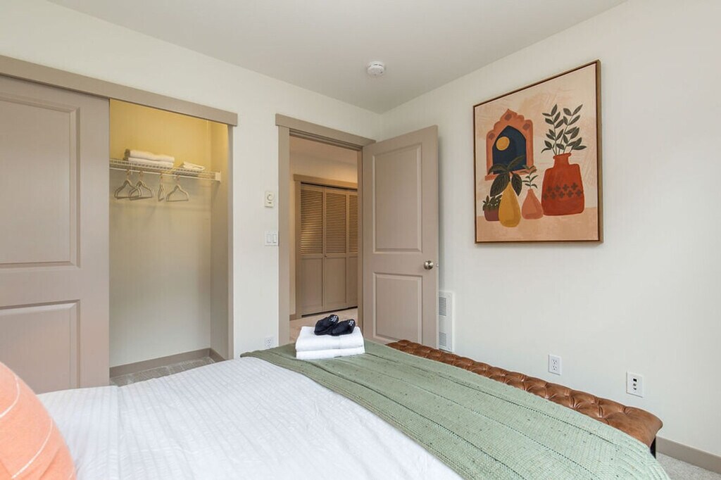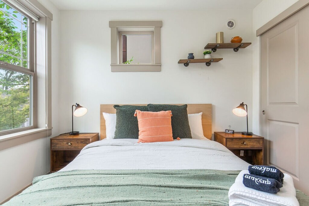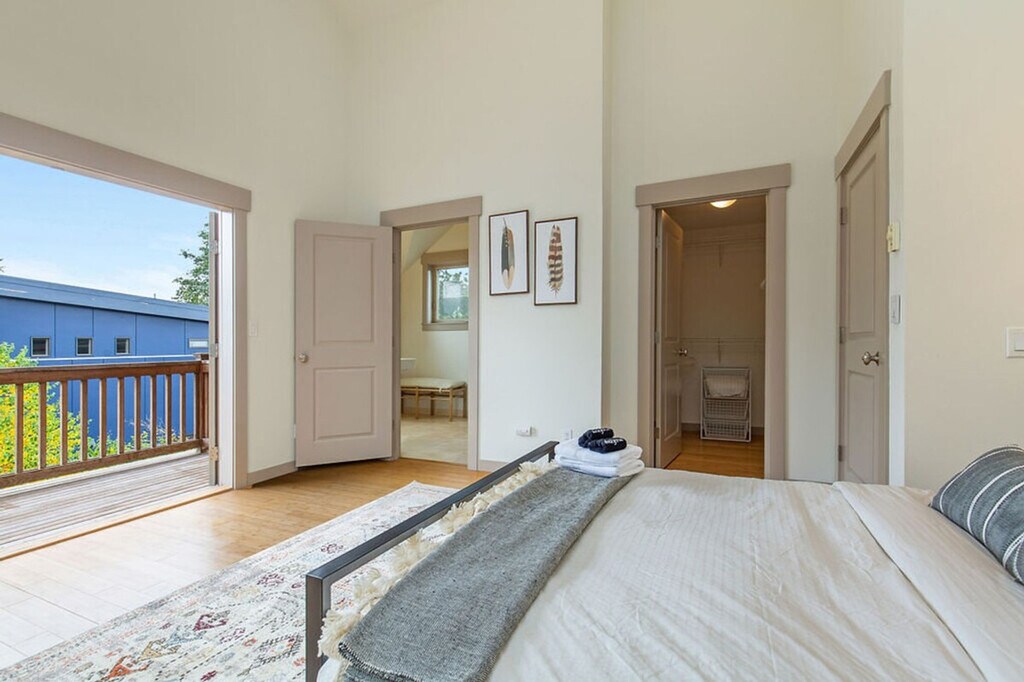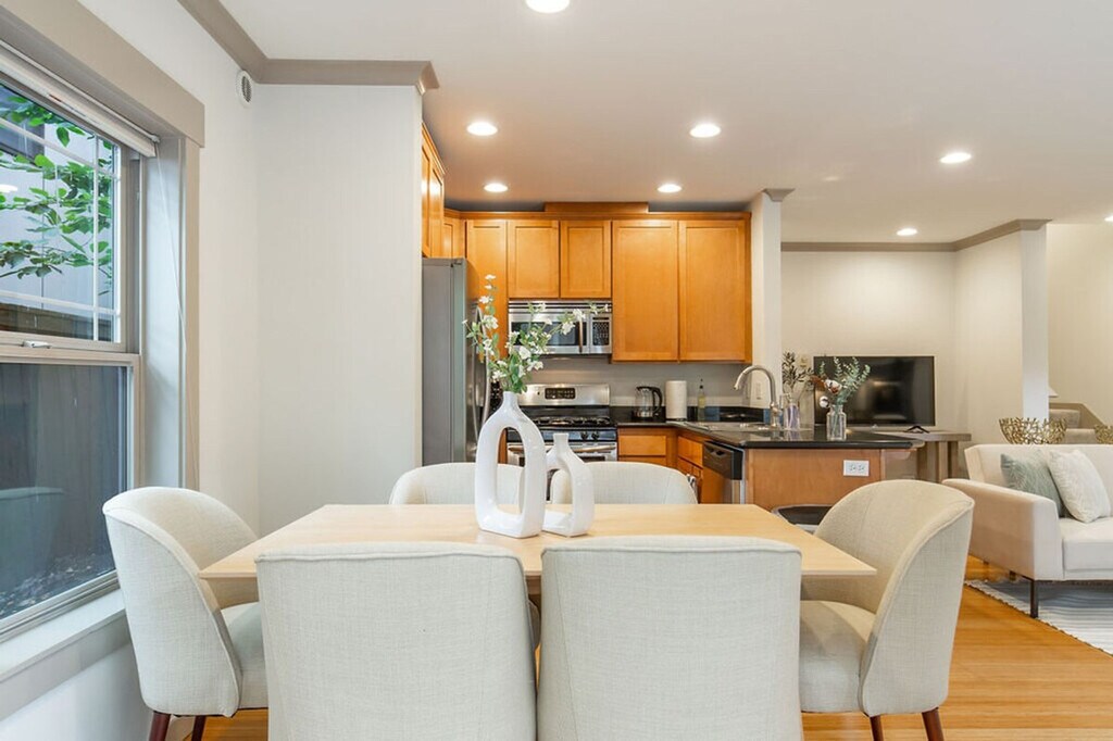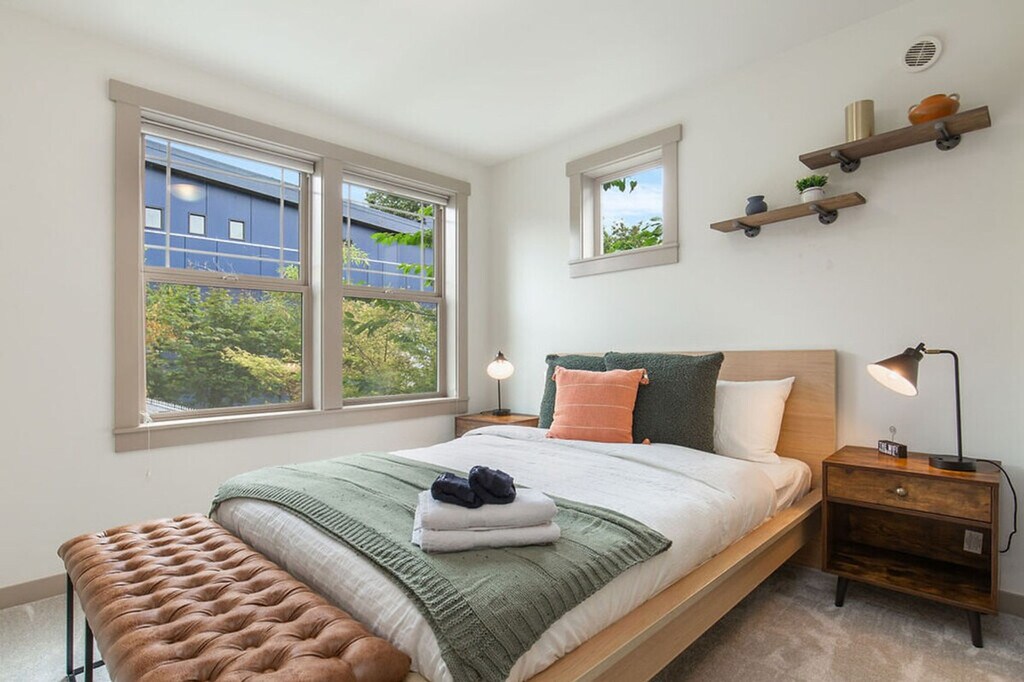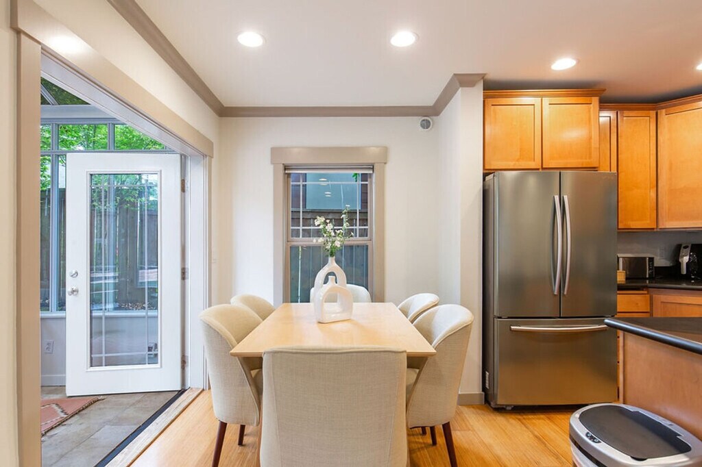 Discover a serene oasis in the heart of the city with this stylish three-story townhome. Featuring three bedrooms and 2.5 bathrooms, this spacious 1560 sqft home offers a light-filled sunroom connected to the dining area, overlooking a private backyard oasis. The upper level boasts vaulted ceilings, an office space, a stunning primary suite, and a deck perfect for morning coffee. Enjoy the convenience of being within walking distance to coffee shops, restaurants, and grocery stores. This home is designed for comfort and convenience, featuring a smart TV with Netflix in the living room and a fully stocked kitchen with high-end appliances, cookware, silverware, servingware, spices, and a Keurig coffee maker. The first floor includes a main entrance, half bathroom, kitchen, dining area, sunroom, and living room with a sofa bed. The second floor offers two bedrooms with queen beds, a full bathroom with a bathtub, and laundry facilities. The third floor hosts the primary bedroom suite with a queen-size bed and an ensuite bathroom with a shower. Portable AC units are available in the summer. This property includes dedicated parking for two vehicles, including a secured garage, which is a rare find in the city. Welcome to the Central District of Seattle, a historically significant and culturally rich neighborhood known for its diverse population and vibrant community. Enjoy an eclectic mix of independently owned cafes, restaurants, shops, and vibrant cultural events and street art. With a high walk score, it's easy to explore the area on foot, and public transportation options are readily available. The home also offers dedicated parking for those bringing a car. This townhome is not handicap accessible and requires comfort with stairs due to its multiple stories. Guest access is provided via a door code. The property is not pet-friendly, with a $500 fine for unauthorized pets. Parties and events are strictly prohibited, with quiet hours between 10 pm and 8 am. Smoking or vaping of any kind is not allowed on the property, including outdoor areas, with a $500 fine per violation. Additional guest fees apply for more than six guests, at $25 per person per night, up to a maximum of seven guests. Dynamic pricing is utilized, meaning rates may change daily. The upper level includes an office space, providing a comfortable area for remote work or study. Registration Number: STR-OPLI-22-001197 [SI]