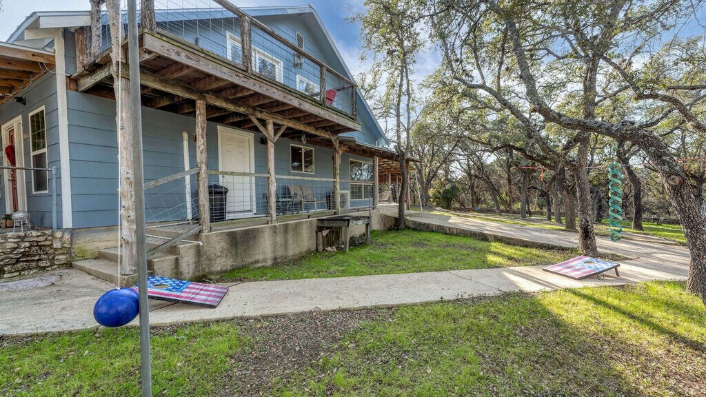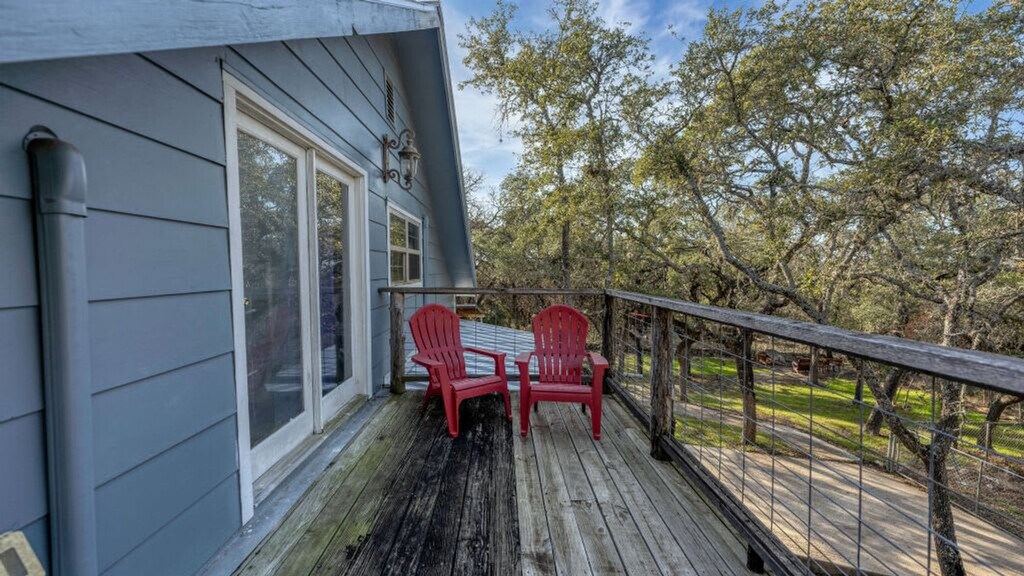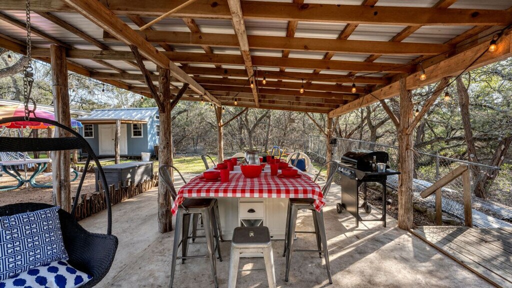 Take a step back in time at this beautiful Inn and feel at home in this unique, rustic, and roomy house with plenty of space for guests. It is great for a quick weekend getaway just for two or a larger family get together. The spacious areas and relaxing porches make this the perfect place to arrange a much-needed girl's weekend or a family BBQ. The feeling of being in a new dimension envelops you under the canopy of oaks, lazing around on the many porch swings, just waiting for your arrival. A cowboy pool is included, great for little ones or adults to cool off. Any number of guests over 10 will have an extra fee. Nestled in the heart of Canyon Lake, Roz's Rusted Porch offers a tranquil escape with easy access to local attractions. You're just a short drive from the sparkling waters of Canyon Lake, perfect for swimming, boating, and fishing. For dining, explore the nearby lakeside restaurants, offering everything from casual fare to delicious seafood (a short 5-10 minute drive). If you're in the mood for shopping or a bit of local flavor, consider a visit to the charming towns surrounding the lake, like Gruene, known for its antique shops and live music venues (approx. 20-minute drive). Quiet hours are between 10 PM and 7 AM. No events, parties, or large gatherings are allowed unless previously agreed with the host. Do not use the heated dry on the dishwasher. Do not go beyond the fence without a valid military ID and a paid day pass. Use amenities at your own risk. Please be respectful of the neighbors. Registration Number: L1813 [SI]