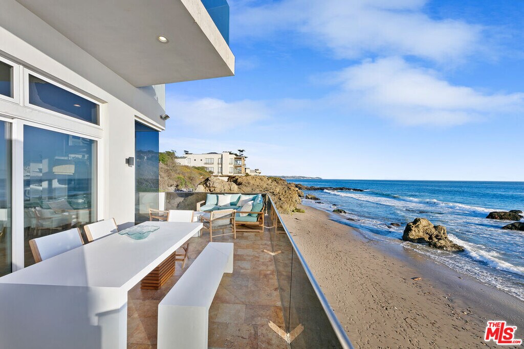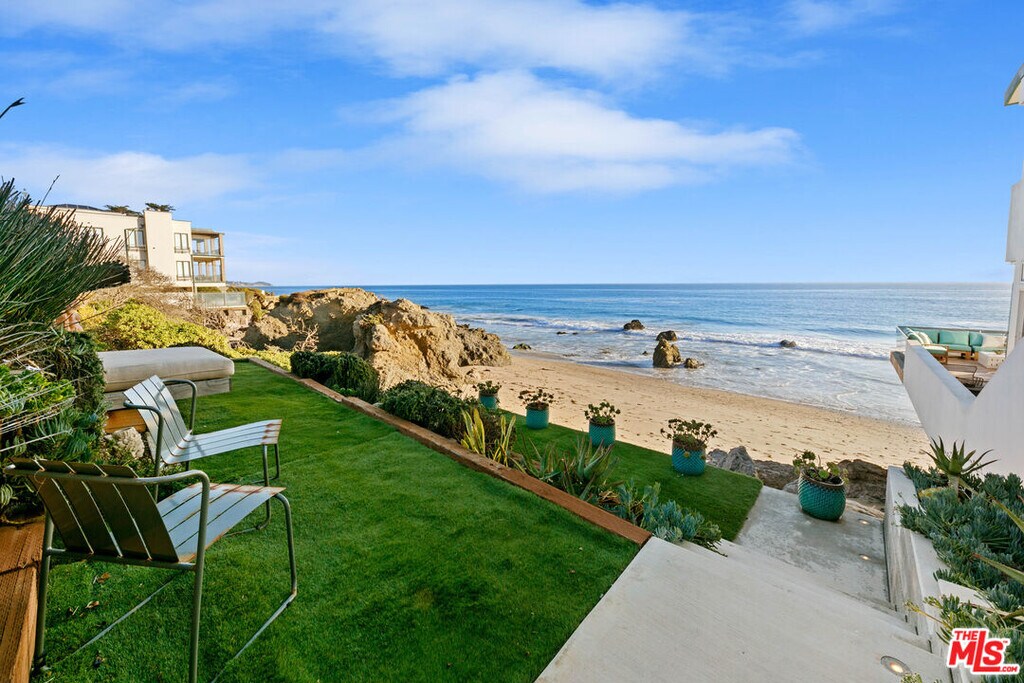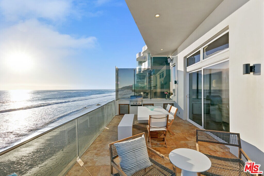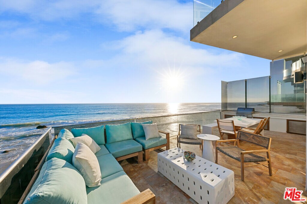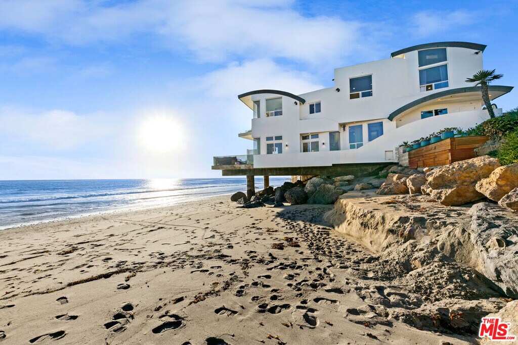 Welcome to this uniquely located seaside escape, a warmly crafted architectural residence situated in a private, gated enclave in the highly coveted Broad Beach neighborhood. This oceanfront retreat captures mesmerizing ocean views from nearly every room. Nestled on two premier beachfront parcels, the property features an impressive 60 feet of pristine ocean front. This custom home was designed 25 years ago by the esteemed Barsocchini & Associates for the current owner. This unique Malibu gem is currently being offered for long term lease. Located in the prestigious Sea Level Drive enclave, the home enjoys exceptional privacy and unobstructed views of dramatic rock formations and twinkling city lights, thanks to its prime position between two development-restricted lots. Architectural highlights include a distinctive Wave Motif copper-clad roof, artisanal art glass windows, bespoke iron railings, and inviting stone bathrooms. The welcoming interiors are characterized by soaring ceilings, expansive picture windows that bathe the rooms in natural light, and charming finishes, creating a harmonious blend of comfort and style. The bright living and dining areas on the main floor open onto a spacious wraparound deck, ideal for al fresco dining, barbecues, and relaxation by the sea. The gourmet kitchen, with its vaulted ceiling, custom cabinetry, bar seating, breakfast nook is a chef's delight. A stairway from the kitchen leads to an outdoor shower and the sandy beach. The main level also includes a bedroom and a full bath, while the lower level features a vast media/recreation room with a fireplace, laundry room, and bath. The upper floor houses three en-suite bedrooms, including the breathtaking ocean-view primary suite. This retreat features two walk-in closets, extensive built-ins, an oceanfront balcony, a spa-inspired bathroom with ocean views. Situated down the hallway lies a stylish library lounge, ideal for zoom calls, reading and relaxing. The adjacent lot provides a terraced outdoor sanctuary for entertaining and soaking in the sound of the breaking surf. The striking rock formations to the east are a source of constant visual delight. A surfer's hideaway for locals is a paddle away. The property includes a two-car garage and additional parking for four vehicles in the driveway. With its superbly executed design and one of a kind beachfront location, this residence invites you, your family and friends to indulge and enjoy the luxury of the Malibu beach lifestyle. MLS# 26635115
