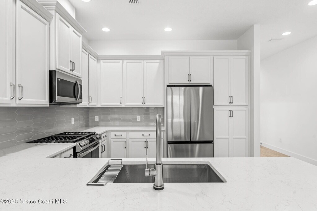 Modern Style. Zero Hassle. Long-Term Living Done Right. Available for a 12+ month lease,this brand-new 2024 3BR/2BA one-story townhome offers open-concept living with high ceilings,great natural light,and neutral finishes. The living space flows to a covered lanai and extended paver patioideal for relaxing or entertaining. The kitchen features quartz countertops,stainless steel appliances,gas range,reverse osmosis,and a large island with bar seating. The primary suite includes a walk-in closet and a sleek bath with dual vanities and a tiled walk-in shower. Two additional bedrooms offer flexible space for guests or a home office. Extras include a 2-car garage,indoor laundry,energy-efficient construction,professional landscaping,and HOA-covered exterior maintenance for true lock-and-leave living. Located in the heart of Viera,close to shopping,dining,golf,A-rated schools,and the beach. MLS # 1069502