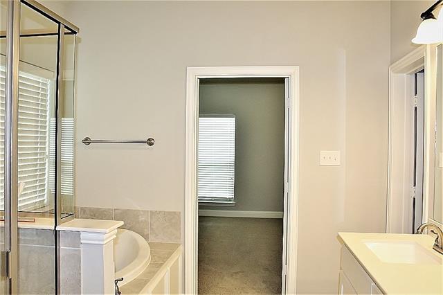 Stunning 3-2-2 nestled in The Cove neighborhood. Lovely open floor plan in neutral colors throughout. Cornerstone fireplace and crown molding accent the living area. Island kitchen features granite counter tops, built-in microwave, dishwasher, disposal, electric cook top with separate oven, refrigerator, walk-in pantry and breakfast bar. Split bedrooms. Spacious and inviting primary suite includes dual sinks, garden tub with separate shower and a walk-in closet. Fenced backyard with large covered patio. Minutes away from shopping and dining. Come see everything this beautiful home has to offer! Owner must approve all pets.