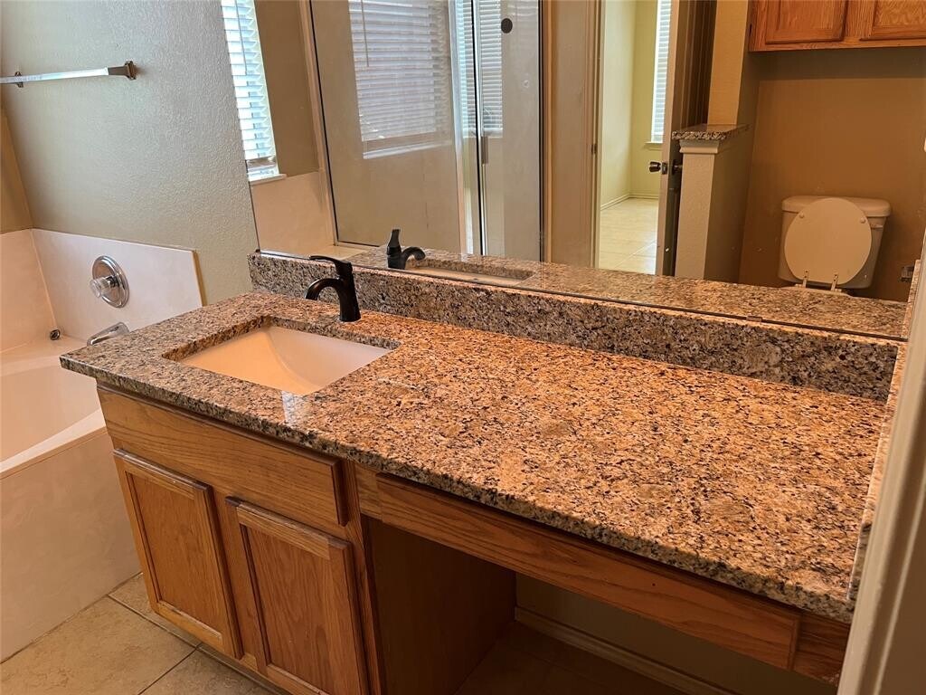 Your family will enjoy this home and neighborhood. It has been loaded with upgraded features from stainless door appliances, double ovens, granite countertops throughout the home, ceramic tiles flooring, separate shower marble garden tub, plus more. Enjoy the sunset view from covered patio, hike and bike trails, community pool and 2 playgrounds. Of course there are major employees close by, amusement parks, shopping and more. Make ready in progress but can be shown. Left fence is being replaced.