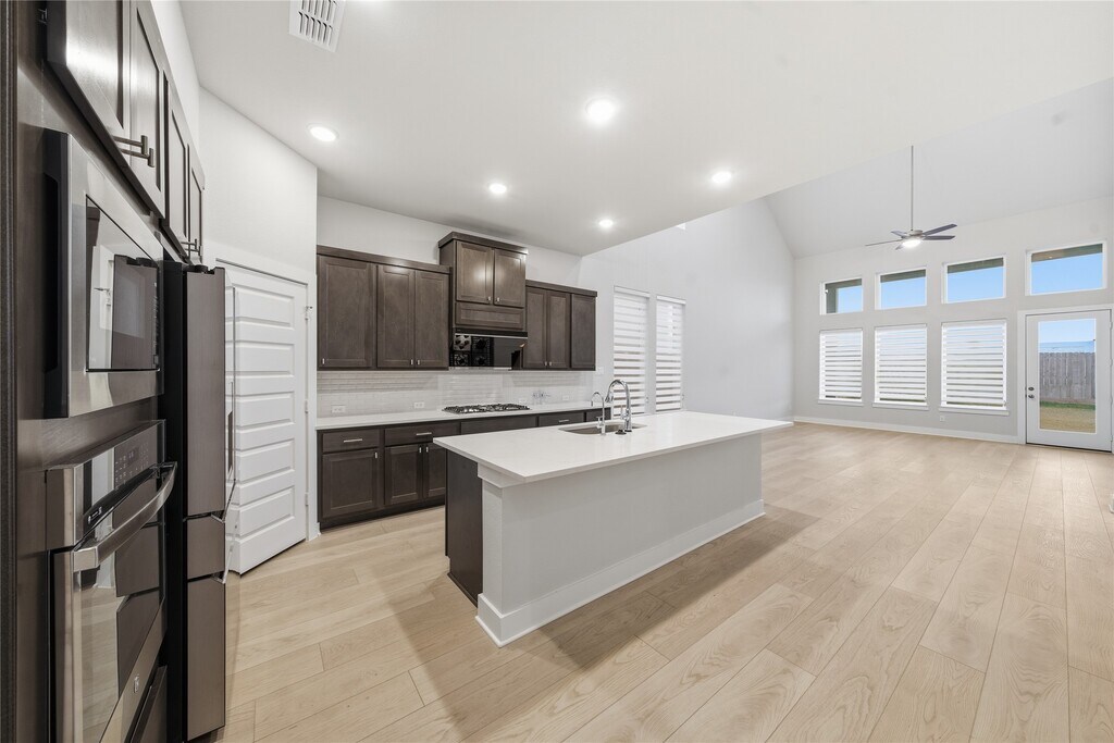This one-year-old Tri Pointe Homes 2-story residence offers 4 bedrooms and 3 full bathrooms on an oversized lot with a stucco and stone exterior and an 8-foot entry door. The foyer features soaring 20-foot ceilings and a curved staircase,leading to an open-concept main level that seamlessly connects the living,dining,and gourmet kitchen with built-in appliances. The first floor includes the primary suite and one additional bedroom,while upstairs features two bedrooms,a game room,and an adjacent media room prewired for four speakers and a subwoofer,complete with a projector and theater screen. The home is also equipped with a water softener and RO system. Refrigerator,washer,and dryer are included. MLS# 71374699