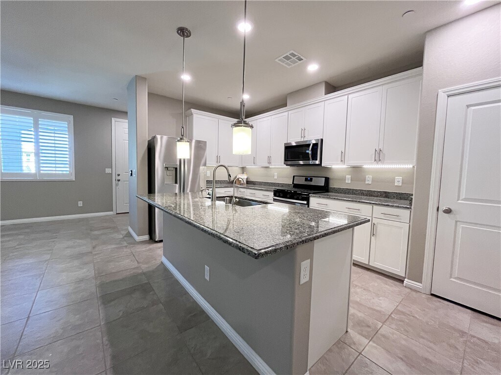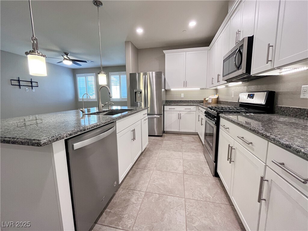 This modern two-story offers a spacious open layout with a large kitchen island, stainless steel appliances, and plenty of cabinet storage. Enjoy upgraded shutters throughout, stylish two-tone paint, and a mix of tile and plush carpet flooring. Every room features upgraded ceiling fans, and the home includes a water softener for added comfort. A 2-car garage rounds out this move-in-ready property in one of Henderson’s most desirable communities of Inspirada: community Pools, Parks, and amenities.
