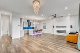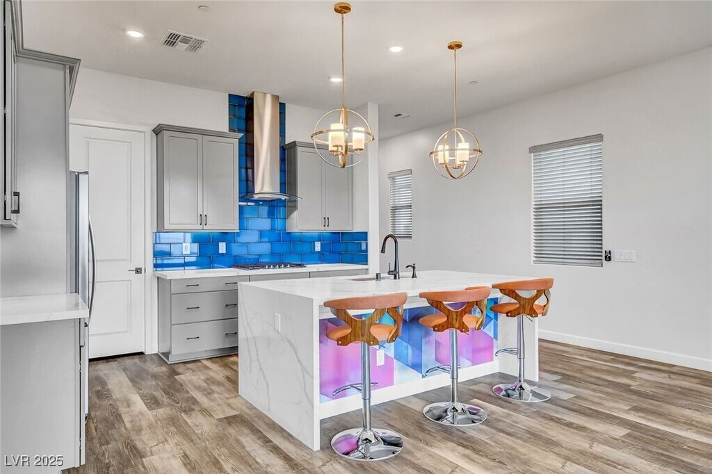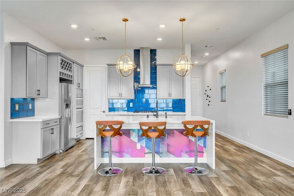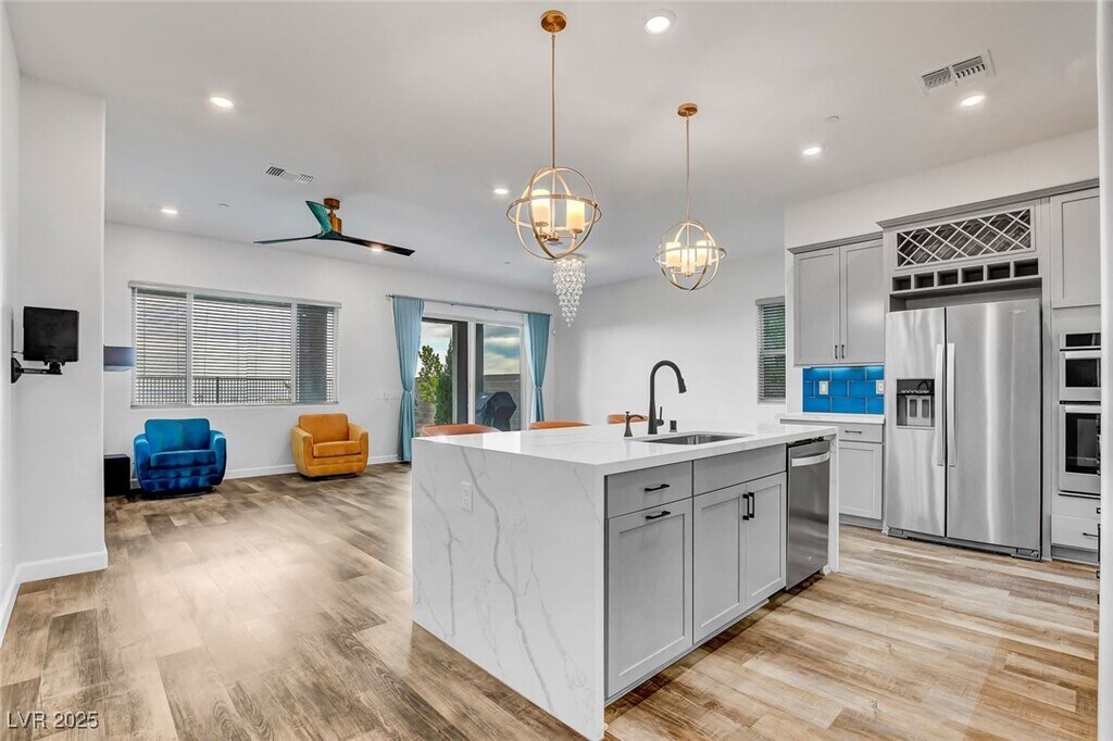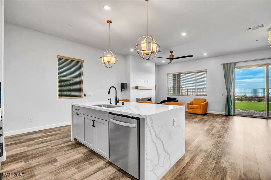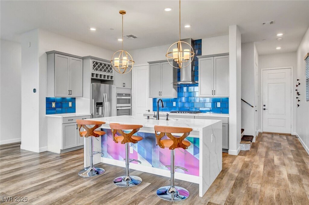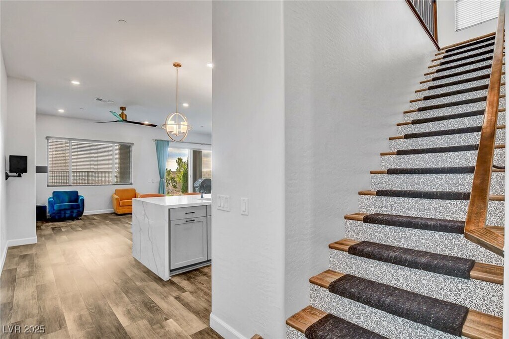 Modern four bedroom in the heart of Summerlin with stunning strip views. This unique property boasts LVP flooring throughout the downstairs. Upgraded kitchen features stunning quartz countertops with a waterfall edge, large island with seating, modern pendant lights, and a large pantry. Incredible strip views from the living room and backyard. Custom electric fireplace and mantle in the living room. Upstairs features four oversized bedrooms plus a loft. Incredible primary with a balcony and more views. Ensuite bathroom features his and hers sinks, large-shower, and a soaking tub. Low maintenance yard with lots of turf. Summerlin location near lots of walking and hiking trails, high-end shopping, and highly rated restaurants. This incredible home will not last long. Tenant places electric, water, trash, and gas in their name.
