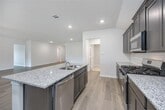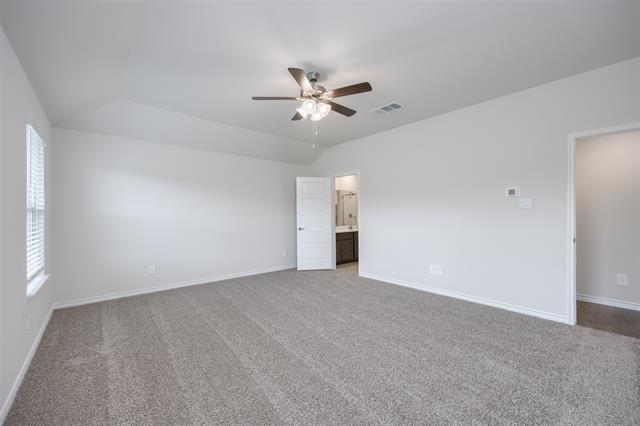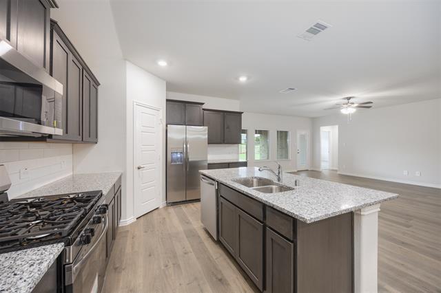 ONE OF A KIND!! Corner Lot, single story home in Fate with Rockwall ISD. Step inside through the covered front porch and into a welcoming foyer that opens up to the dining room, family room, and kitchen. This generous open-concept layout was made for both everyday life and hosting guests with ease. The kitchen is a true centerpiece, featuring a large island with an undermount sink, quartz countertops, a decorative tile backsplash, corner pantry, stainless steel appliances, and 36'' upper cabinets. Just off the kitchen, you'll find a convenient utility room with an additional closet for extra storage. Tucked away at the back of the home, the primary suite is your personal retreat. The spacious bedroom leads into a well-appointed bathroom complete with a walk-in shower, a raised cultured marble double-sink vanity, and a private toilet room. A walk-in closet with ample shelving connects directly to the bath for added convenience. On the opposite side of the home, Bedroom 2 and Bath 2 offer a private setup that works beautifully for guests or a family member who values their own space. Toward the front of the home, three additional bedrooms share Bath 3. Each room comes with a shelved closet, and the shared bathrooms include a shower and tub combo and built-in shelving. A study off the family room rounds out the layout with its own closet as well. Vinyl flooring flows through all the main living areas and the primary bedroom, while the secondary bedrooms feature cozy carpet. Outside, enjoy a covered back patio, full sod, AND TEXAS SIZED BACK YARD! This home also comes equipped with the Smart Home base package, including an Amazon Echo Pop, video doorbell, smart front door deadbolt, home hub, smart thermostat, and Deako® smart switches — keeping your home connected and secure from day one.