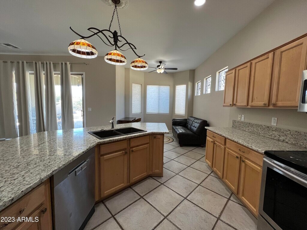 Welcome to the Sonoran Foothills. This 3 bed,2 bath home with Den is ready to rent! Large bedrooms,master bath with separate shower & tub,walk-in closet,spacious living / Family room,Eat in Kitchen,formal dining,stainless steel appliances,Granite countertops,bay windows with plantation blinds. Pergo and tile flooring throughout and Carpet in one room,Ceiling fans throughout,2 Car garage with built-in cabinets,and Gated RV parking on the side of the home. Desert-style Backyard with Pool (Spa not heated) a,seating and beautiful desert views. Pool service included.