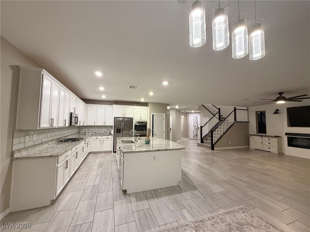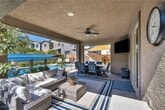 Beautifully maintained and move-in ready 5-bedroom, 3-bath home located in a gated Henderson community. Open-concept floor plan with a bright living area and modern kitchen featuring an island, stainless steel appliances, and walk-in pantry. Primary suite includes a private balcony with park views and a large custom walk-in closet. Exceptional backyard with heated pool, covered patio, and professionally landscaped yard—ideal for outdoor living. Additional features include solar panels, powered window shades, custom storage throughout, Ring security cameras, and an oversized garage with built-ins. Approx. 3,058 sq. ft. of living space plus 497 sq. ft. garage. Immaculate condition and pride of ownership throughout. Ready for Move-In immediately.