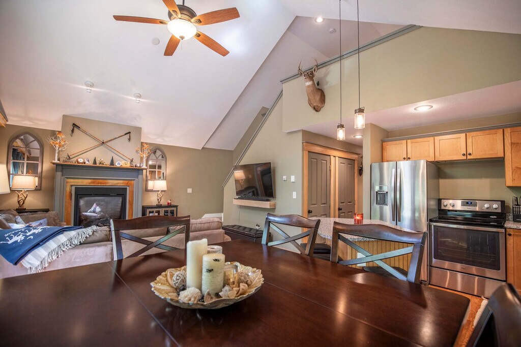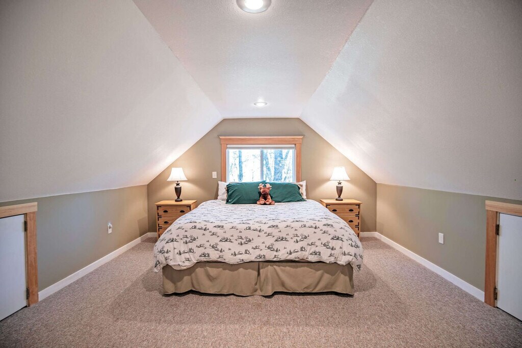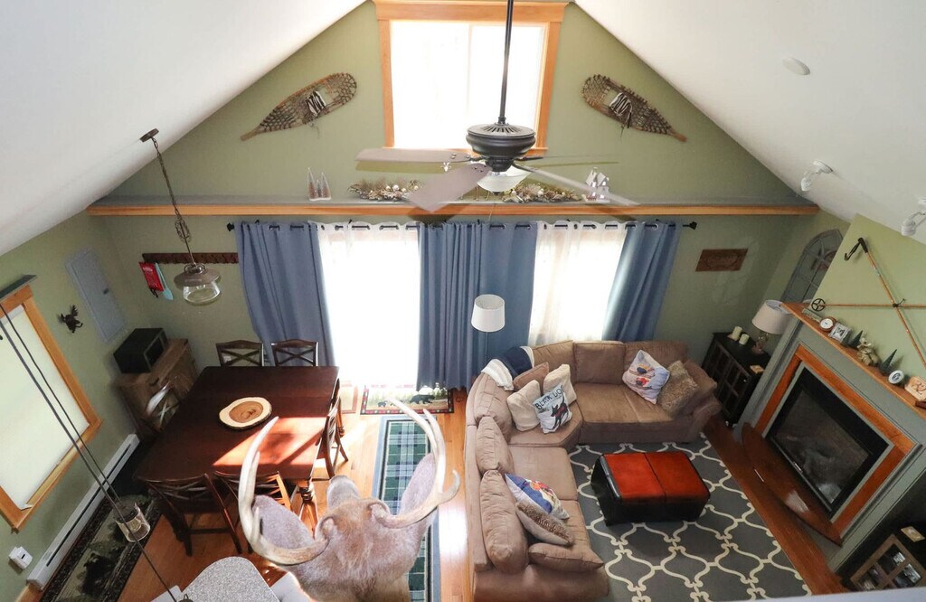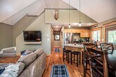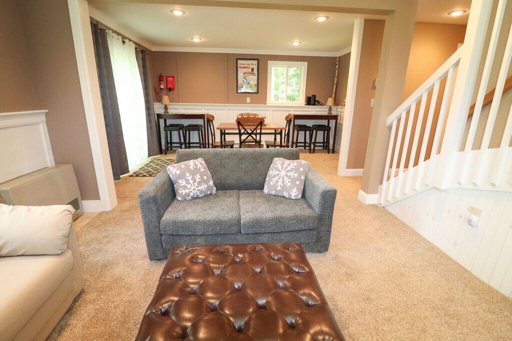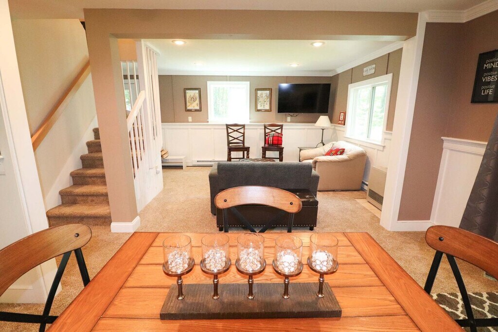 Feel at home in the Finley Lodge, a 4-bedroom, 2-bathroom chalet that sleeps 8, located just 5 minutes from Attitash Mountain and Story Land. This chalet features a large living room with a Smart TV and a gas fireplace, an outdoor patio with a brand new firepit area, in-unit laundry, baseboard heat, and 3 window AC units. The fully equipped kitchen has updated appliances, a drip coffee machine, and 4 barstools at the island. Coffee, sugar, and creamer are provided to help you settle in. The dining space includes an 8-person dining table and 4 additional barstools at the kitchen island. The game room features a Smart TV, board games, a 4-person table, and access to the back deck and patio with a grill and firepit. Parking is available for up to 3 cars. This property is dog-friendly. Perfectly located minutes from skiing, shopping, restaurants, snowmobiling, and hiking, this home is also just 15 minutes from North Conway and 20 minutes from Wildcat Mountain. Diana's Baths and the Mount Washington auto road are a short drive away. Bartlett, New Hampshire is a gateway to the renowned White Mountains and is a 10 to 15-minute drive from downtown North Conway, known for tax-free outlet shopping, restaurants, the Conway Scenic Railroad, and plentiful outdoor activities. A grocery store is less than 5 minutes away, and a pharmacy is less than 10 minutes away. Quiet hours are observed between 9 PM and 9 AM. You must be at least 25 years old to book. There is a Ring Doorbell Camera on the exterior of the property facing the driveway and another at the side entrance. These are not monitored but do record. There is also a Minut noise monitor system located inside the property in the kitchen/living room that measures volume levels, but does not record anything. Tampering with the device is strictly prohibited. [SI]