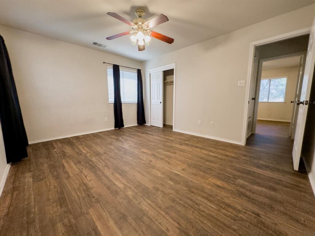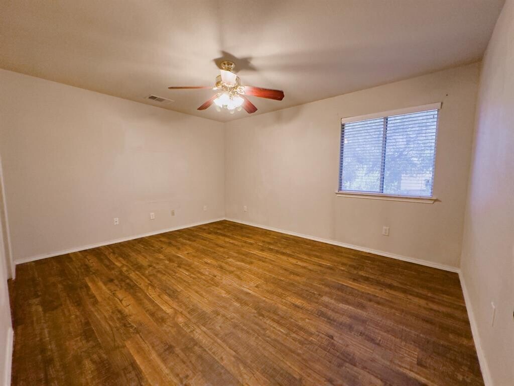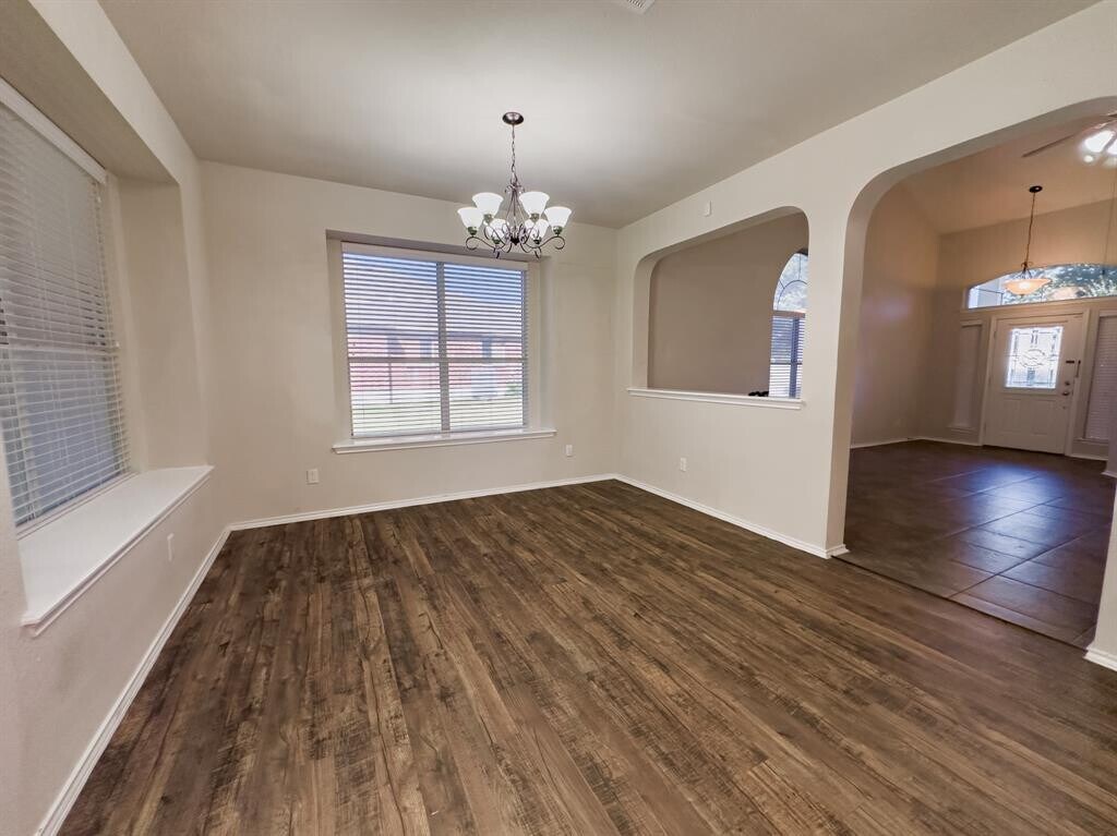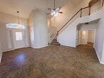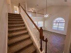 Welcome to this charming 3-bed, 2-bath single-family home with a spacious 2-car garage, where comfort and style come together effortlessly. As you arrive, the generous front yard welcomes you with mature trees and neat landscaping, offering a peaceful view from the covered entryway. Step inside and you’re greeted by a stunning double-height living area, complete with overhead ceiling fans and a unique pass-through hatch that opens to the dining room, beautifully accented by a classic chandelier. Just off the dining area, the fully equipped kitchen features a dishwasher, electric range, built-in microwave, stainless steel refrigerator, and a roomy pantry for all your storage needs. The main bedroom sits conveniently on the first floor for added privacy and ease, while upstairs you’ll find a versatile second living area - perfect for a cozy lounge, play area, or home office - along with two additional bedrooms. Out back, a spacious, fully fenced yard invites you to relax under the covered patio and enjoy the outdoors in comfort. $500 refundable pet deposit per pet. $25 monthly pet rent per pet. Admin. Fee due upon lease signing: $295. Pet status must be registered at