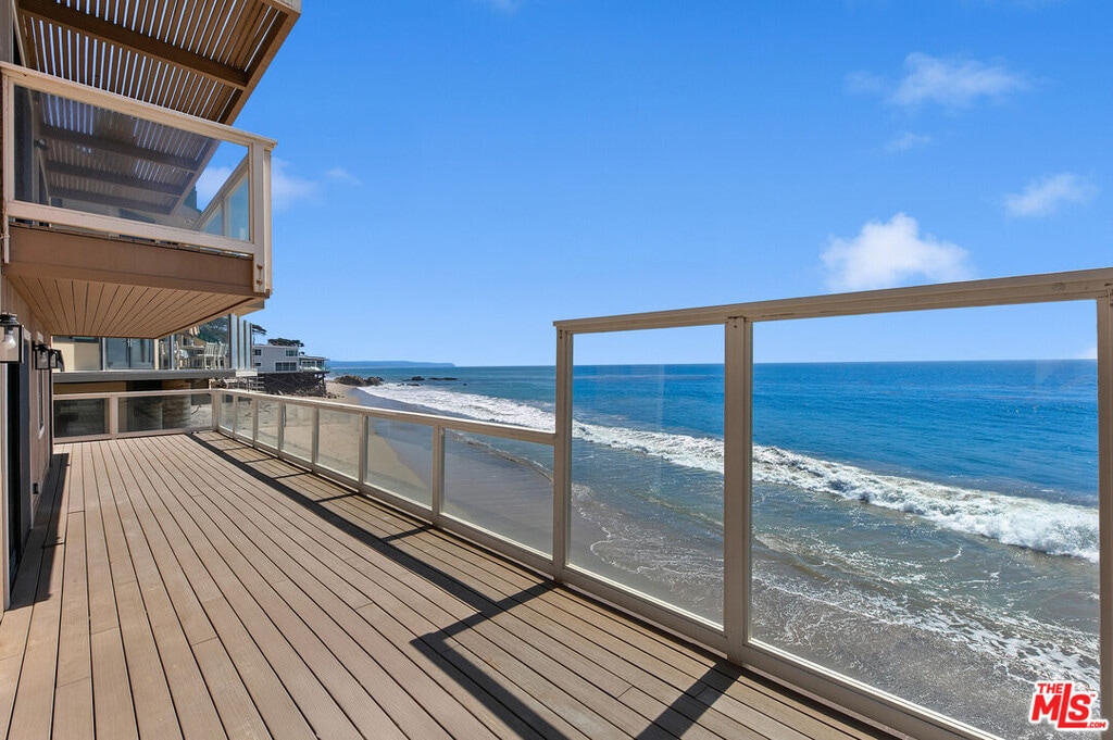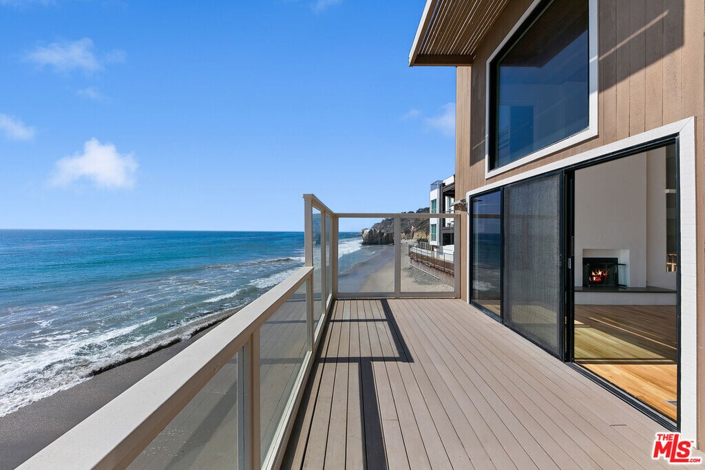 Experience beachfront living at its finest on one of Malibu's most picturesque stretches of sandy coastline. Located in a gated community with a private driveway, this home captures sweeping ocean and whitewater views, with vistas of the dramatic rock formations at El Matador Beach and far beyond. The living room is an entertainer's dream, featuring soaring ceilings, a wet bar with a wine fridge, a fireplace, and floor-to-ceiling windows gazing over the waves below. Sliding glass doors open to an expansive ~50-foot sun deck with 180-degree views of rocky outcroppings and passing sea life. The kitchen offers an island with bar seating, stainless steel appliances, and seamless flow into the dining area and den, with a second fireplace for cozy seaside evenings. Upstairs, the primary suite spans the front of the home with serene views in every direction. Two sets of sliding doors open to a private oceanfront balcony, while the en-suite bathroom features dual vanities and a walk-in closet. Two additional bedrooms, a full bathroom, and a powder room provide comfortable accommodations for family or guests. At the entry level, a private gate leads directly to the sandy beach and surf below, with nearshore reefs perfect for the ocean enthusiast. A fully enclosed courtyard ensures easy and secure access to the 3-car garage. For those seeking coastal bliss with views from sunrise to sunset, this retreat presents a rare opportunity to live in one of the best locations in all of Malibu. Available now for long-term lease. MLS# 25594111