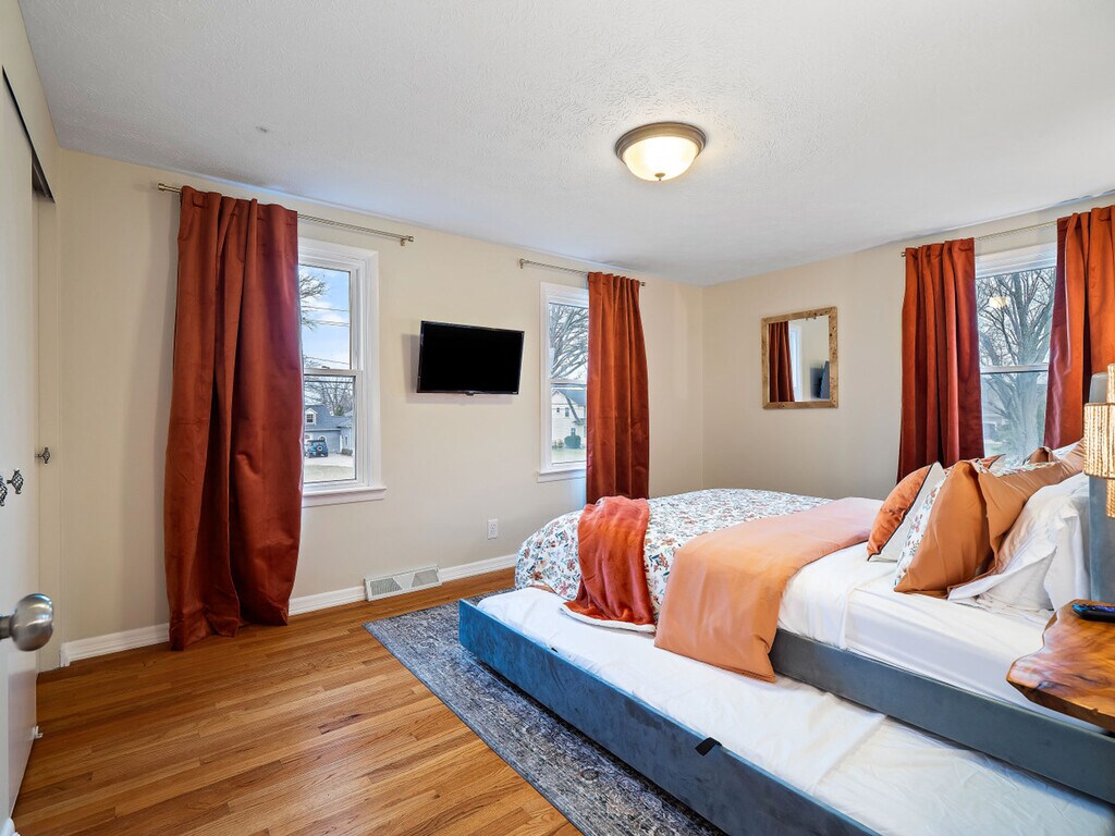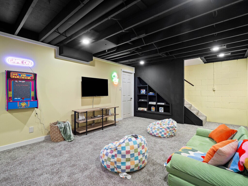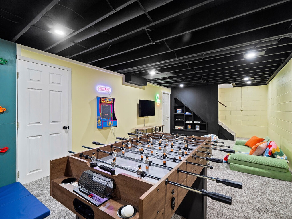 Feel at home in this Avon Lake escape, ideally located directly across the street from Lake Erie with easy access to lake views, waterfront walks, and all the charm this shoreline community has to offer. This spacious home is ideal for families, groups, and memory-making getaways. The first floor features a large living room with a comfy sectional, chairs, and a Smart TV. The recently remodeled kitchen includes an island with seating, modern appliances, and a fully stocked coffee bar with coffee, syrups, sugar, and creamer provided. The dining room seats 8, plus an additional bar-top for 2 that overlooks the game room. The game room offers a pool table, bar with barware, record player, Smart TV, and decorative fireplace. The basement is a kids’ paradise, featuring seating and a Smart TV, a Nintendo Wii with 3 games, a multi-game table (foosball, ping pong and air hockey), and a built-in climbing wall with cushioned mats below. Step outside to a private patio and fully fenced yard. Laundry room is available for guest use in a separate space in the basement. Up to 2 dogs are welcome for a flat fee of $125. Requests for a 3rd or 4th dog are subject to approval and an additional $100 fee. The lake is directly across the street, making sunrise walks, sunset views, and lake breezes part of your daily routine. This home is minutes away from Miller Road Park and Veterans Memorial Park, downtown Avon Lake shops, dining, and cafes, and offers easy access to Cleveland, Cedar Point, and area beaches. Quiet hours are from 10 PM to 8 AM, and excessive noise may result in a $500 fine. No smoking is allowed inside the house, and a violation will incur a $500 fine. Pets must be disclosed and approved in writing before your stay, and undisclosed pets will result in a $150 fee and may lead to cancellation without refund. No cats are allowed. [SI]