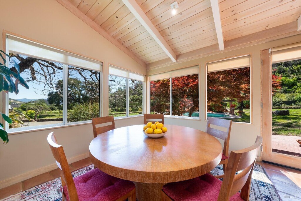 Mid century style home in a story book garden setting surrounded by lush nature, large swimming pool, vineyards and multiple garden vignettes for enjoying the outdoor space. Private, quiet, filled with natural light 2 bedroom 2 bathroom main home with a spectacular master suite. Separate second unit offers a generous studio space with a full bath that could be used as a multipurpose unit. Double glass doors facing garden with pool allows maximum natural light. Main house first floor offers separate living and dining rooms, wood burning fireplace, office space with one of a kind desk and tables, vaulted ceilings, gourmet kitchen, screened in porch, one bedroom, full bath, laundry and wine cellar basement. Second story takes you on a glassed walkway leading to master bath and bedroom. Master bath is ample with multiple wall to wall glass mirrored closet space, large glass shower with picture window looking onto nature and access to spa from master bedroom. If you are looking for privacy and a beautiful retreat this is the place to be, located a few minutes away from the town of Calistoga and all it has to offer, a true gem. MLS#325073612