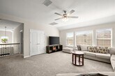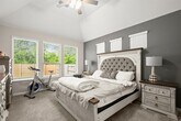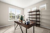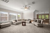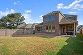 This well-designed 3,065 square-foot home is spacious with four bedrooms and 2.5 bathrooms. This property is located in the community of Anthem and has no direct back neighbor. The trees behind the house make this house feel private. When you walk in, you have a dedicated office space. Venture to the living area and kitchen. Many windows make this space bright and airy. An exceptional blend of open concept and defined spaces makes this home comfortable and welcoming. Downstairs, you have a powder room for convenience. The resident chef's kitchen is stunning! Features a kitchen island with breakfast bar, sparkling quartz, tile backsplash, a built-in microwave+ Oven, stainless steel appliances, and a breakfast area. Your downstairs primary bedroom has high ceilings, a wall of windows, and plush carpet. Your ensuite w/ a luxurious garden soaking tub, walk-in shower, his/her vanity, and WIC. Head upstairs, and you will find two additional bedrooms and a full bath. You also have a spacious mixed-use area. Relax and unwind under your covered patio. It is located in the coveted area of Waterleaf and Hays ISD. Great location. Close to the neighborhood, Anthem Pool, main roads, great shopping, and so much more!