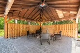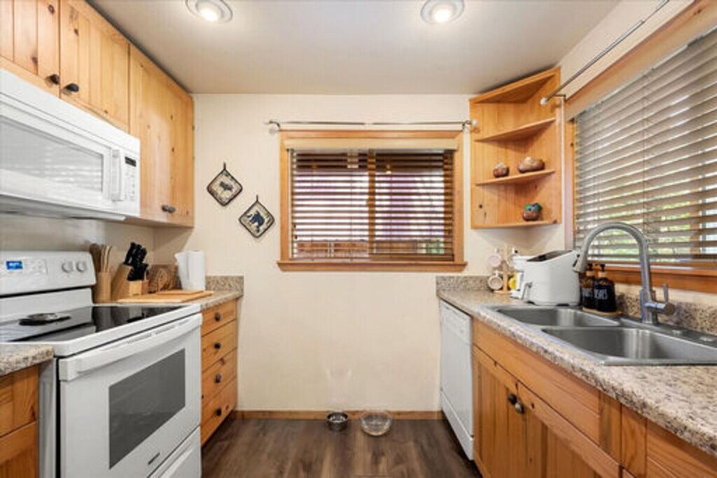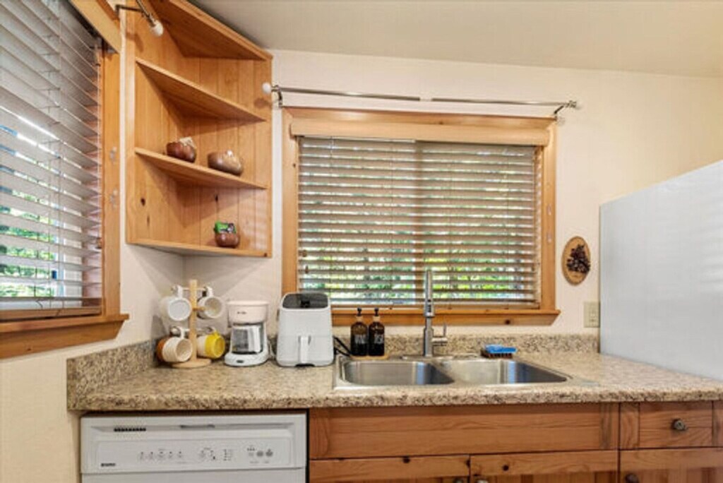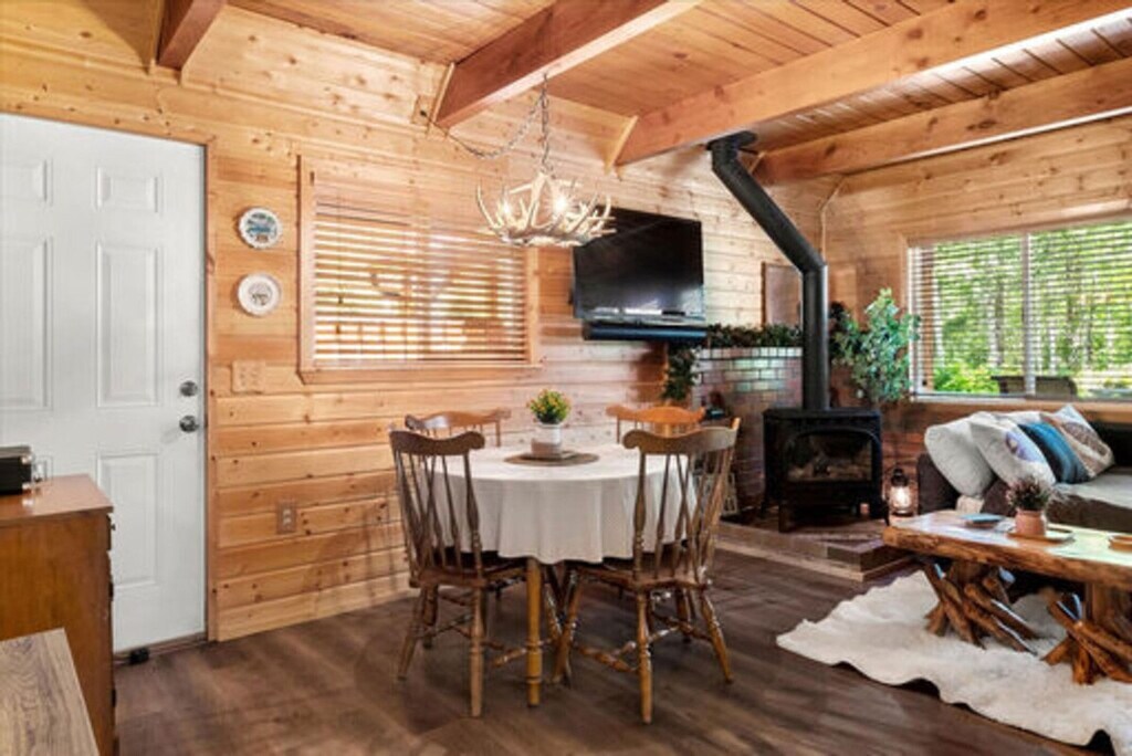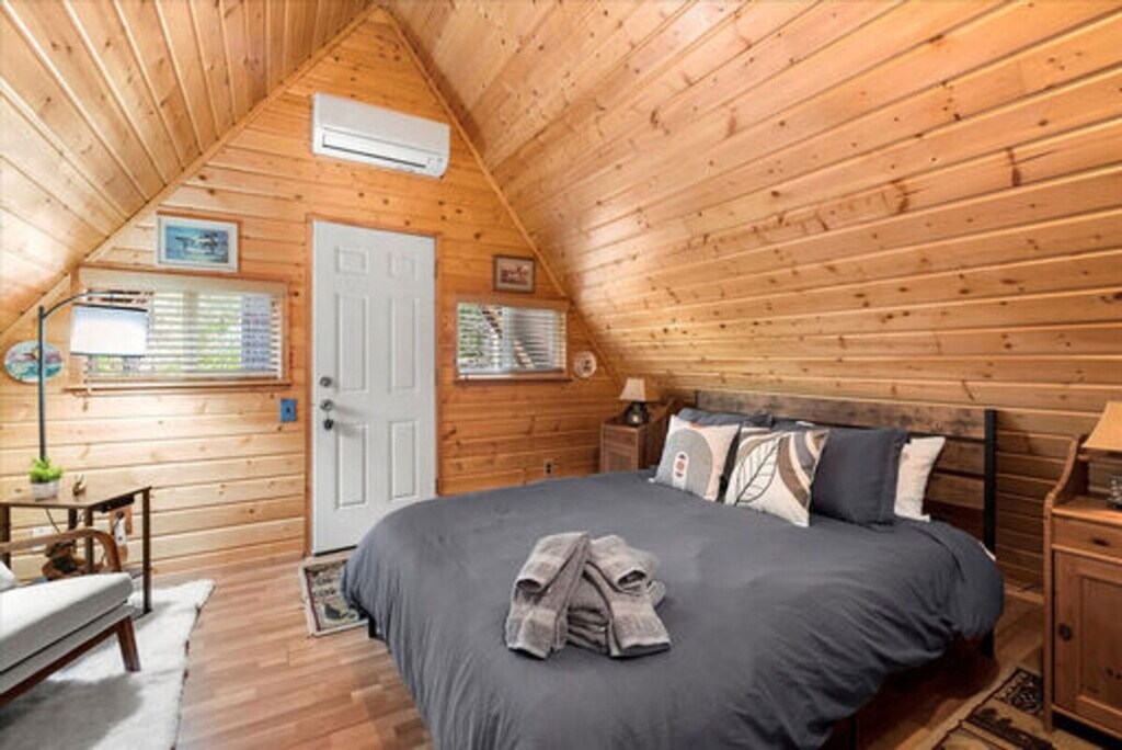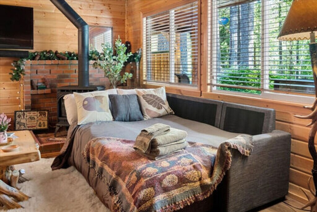 Feel at home in this serene and private cabin near Mt. Rainier! This two-story home has 2-bedrooms, 1 bathroom and is around 816 sq ft with a few steps to the entrance door. Relax around the stone fire pit, gather around the picnic table for a cookout, or soak in the bubbling hot tub; all areas are covered for you to enjoy them rain or shine. The community area includes a lake for fishing/swimming, a picnic area, a community building, and walking trails. The home also features a smart TV, internet for streaming, high-quality bed, mattress, pillows and linens for comfortable sleeping, and a fully stocked kitchen for all your cooking needs. An on-site washer and dryer are available for all your laundry needs. All outdoor activities are under covered spaces including picnic table, fire pit and hot tub. Pets are welcome with a fee of $50 per pet per night, which has already been included in your invoice if you selected pets on your reservation. Strictly no parties and events are allowed, and quiet hours are between 10pm-8am. There is no smoking or vaping of any kind allowed anywhere on the property, including outdoor areas, and no digital piracy or shoes in the home. A $500 fine will be imposed per violation. If you bring a pet, kindly refrain from allowing pets on furniture/linens including couches, throws, beds, pillows, and towels. Please do not leave pets unattended and bring poop bags to pick up after your pets. Use of the fire pit and charcoal grill are prohibited during the burn ban. The regular nightly rate covers 4 guests. Additional guest fees are $25 per person per night, up to a maximum of 5 guests. Please indicate an accurate number of guests. [SI]