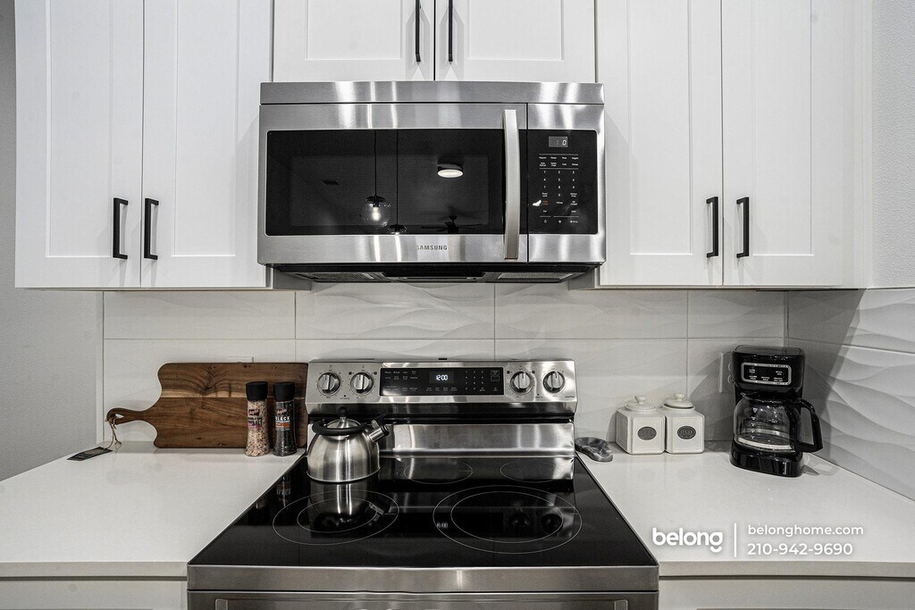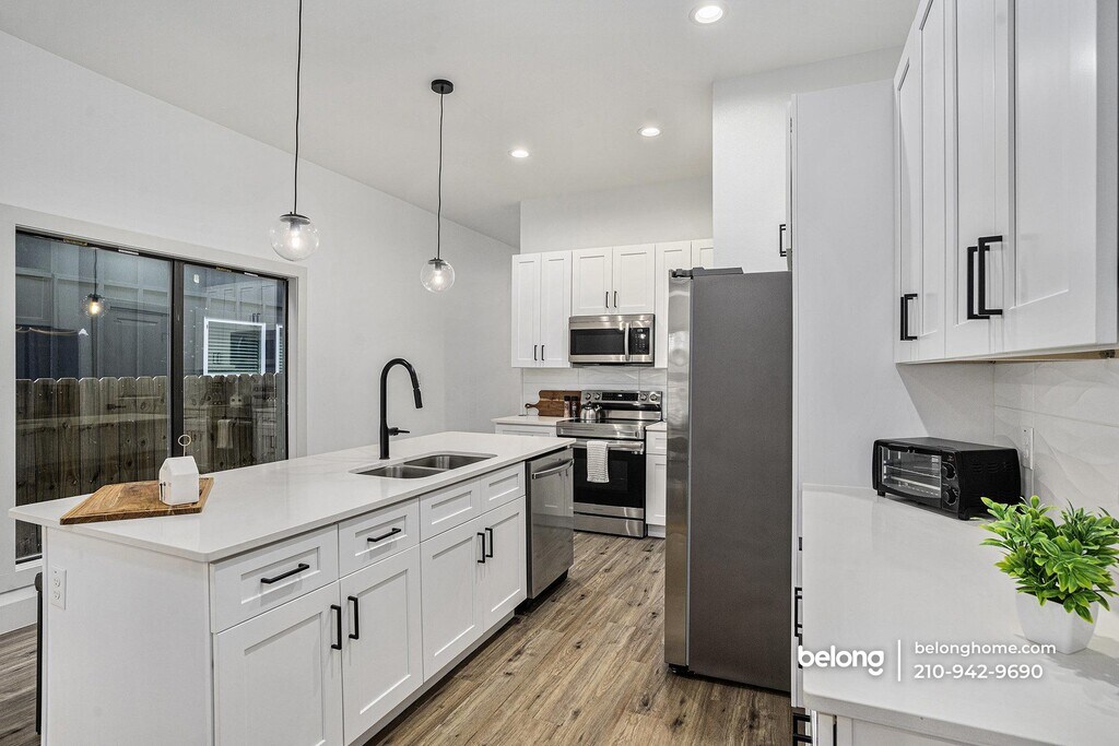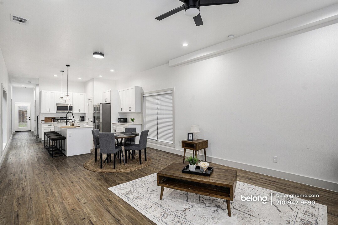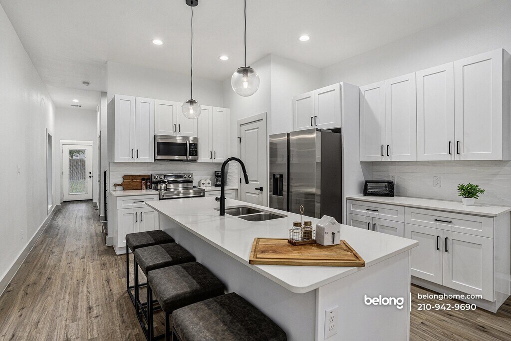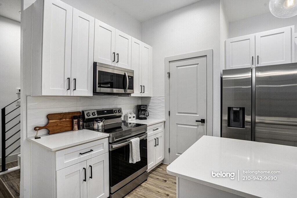 A striking modern structure defines this home, offering three bedrooms, 3.5 baths, and a thoughtful layout designed for both ease and comfort. Step into the living area to find clean lines, warm flooring, and generous wall space that invites you to shape the room exactly the way you want. Central A/C, heat, and a digital thermostat support year-round comfort with simple, intuitive control. Just beyond, the kitchen brings together white cabinetry, stainless-steel appliances, and a long island that accommodates seating, prep, and conversation all at once. Ample storage and wide counters give you the flexibility to cook, host, or keep things wonderfully simple during busy weeks. All three bedrooms sit within well-proportioned spaces, including a primary suite with its own ensuite bath featuring a sleek vanity and a spacious walk-in shower. Two additional full baths and one half bath serve the rest of the home, giving everyone the convenience they need. A covered balcony extends your living space outdoors, creating a private corner for morning coffee or quiet evening breaks. Living in this part of San Antonio places you near excellent everyday conveniences. Nearby, you’ll find H-E-B for groceries, local favorites like Liberty Bar and Feast for dining, and quick access to the River Walk and Hemisfair for open-air recreation. Commuting is simple with I-10 and I-37 close by, connecting you to the wider city within minutes. *This home is photographed with furniture in it, but will be leased UNFURNISHED. *Our homes come as-is with all essentials in working order. Want upgrades? Request it through the Belong app, and our trusted pros will take care of the rest!