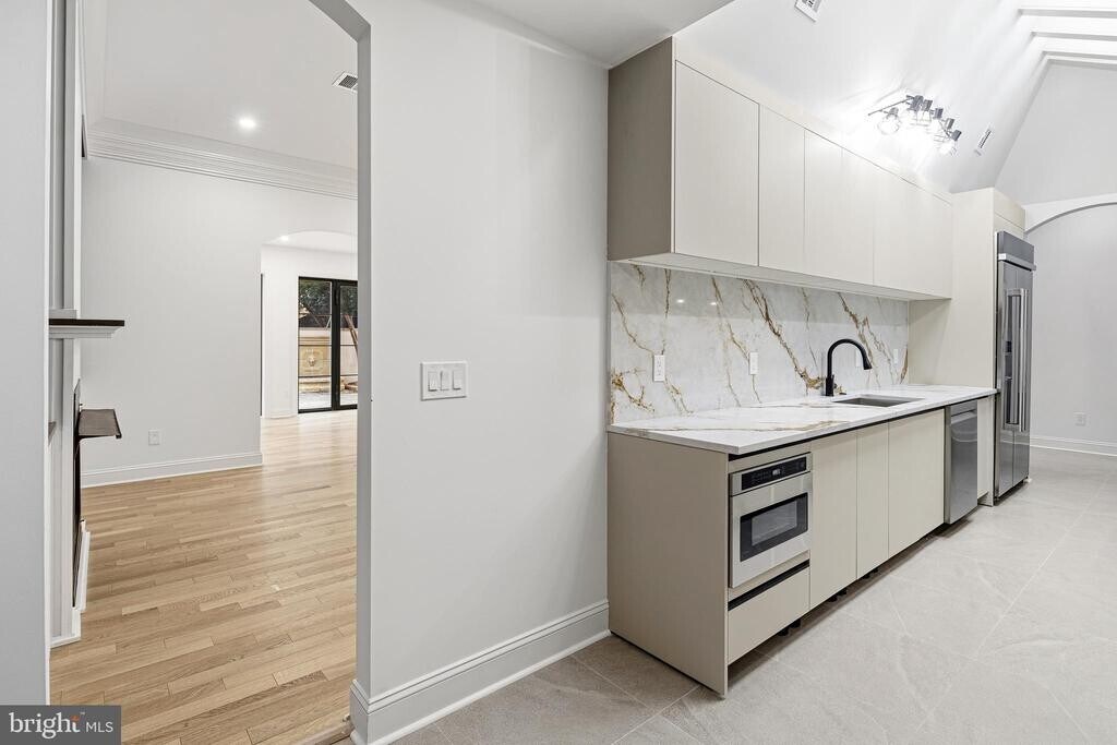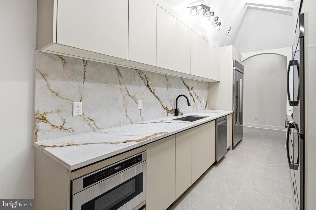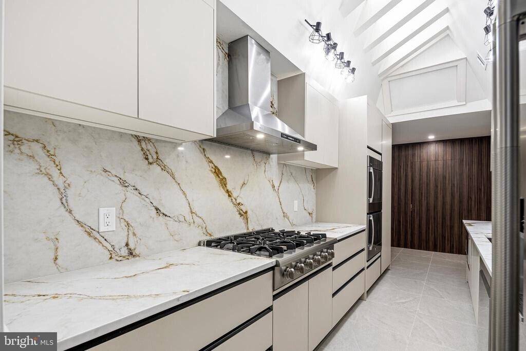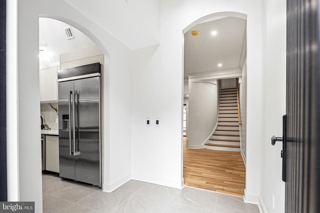 This exceptional, newly renovated double-wide home in the heart of Society Hill offers a rare combination of scale, design, privacy and modern luxury—creating a true urban sanctuary with every city convenience at your doorstep. A dramatic, tall-ceiling foyer welcomes you into an expansive living and entertaining space, featuring custom built-ins, a gas fireplace, soaring wood-accented ceilings, and a stylish wet bar with beverage refrigerator. The open dining area is framed by elegant architectural arches, while French doors and windows flood the space with natural light and open to an expansive, beautifully landscaped rear garden complete with a marble fountain—an ideal setting for indoor-outdoor living. The chef’s kitchen is both functional and refined, highlighted by skylights, natural stone countertops and backsplash, and premium stainless steel appliances, including a six-burner range, double ovens, a 42-inch refrigerator, and a deep sink. A built-in pantry, abundant cabinetry, and a charming breakfast nook complete the space. The main level also includes a powder room and a convenient mudroom with direct access to the backyard. Radiant heated hardwood floors run throughout this level, adding warmth and comfort. Upstairs, the second level offers a spacious family room, perfect for relaxation or additional entertaining, along with two generously sized bedrooms connected by a beautifully finished Jack-and-Jill bathroom featuring a walk-in shower. This level also includes an additional powder room and a full laundry area with side-by-side washer and dryer. The entire third floor is dedicated to a luxurious primary suite, featuring vaulted ceilings, a large walk-in closet, and a spa-like bathroom with a soaking tub, oversized walk-in shower, double vanity, and heated floors. This truly one-of-a-kind residence delivers refined living, thoughtful design, and rare outdoor space in one of Philadelphia’s most sought-after neighborhoods.