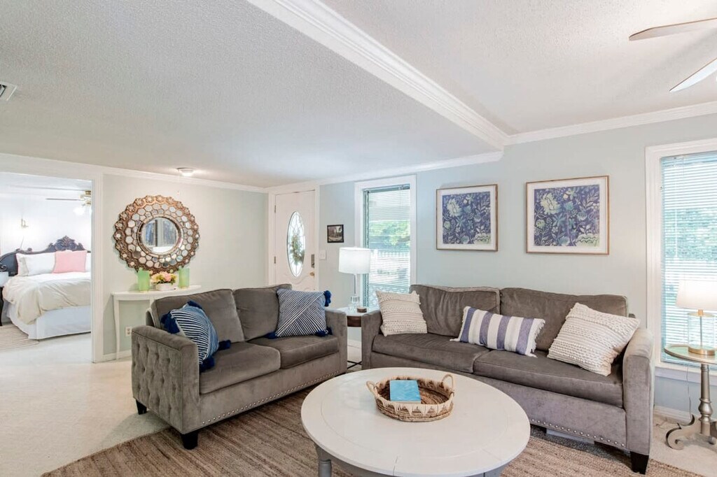 Welcome to Dozing on Dog River, a cozy cottage where you'll feel at home! This 3-bedroom, 2-bathroom home sleeps up to 10. This home features multiple outdoor seating areas, a spacious front porch, a fully equipped kitchen, an oversized TV, and complimentary Wi-Fi. The living room includes a queen sleeper-sofa, a large TV, and extra chairs. The dining room seats six and overlooks both the kitchen and the living room. The spacious kitchen features a full-size refrigerator, gas cooktop, oven, microwave, and a bistro table with two chairs overlooking the backyard. The first bedroom on the main level features a queen bed and ample closet space. The second bedroom also has a queen bed and access to the patio and backyard. There is a fireplace in the bedroom, however, it is not operational. Downstairs, which is accessible via steep steps with a set of bells on the door for safety, there are four twin beds and ample space for blow-up mattresses. The backyard offers multiple outdoor spaces, including a private patio off the second bedroom and a larger patio area off the basement. This is a pet-friendly home with a fee. A pack 'n play/travel crib is available upon request. Nestled in a quiet, rural area of Mobile, just off Dog River, this home is less than 10 minutes away from local favorites like McNally Park, The River Shack, and Grand Mariner, making it a peaceful yet convenient stay. Quiet hours are between 10 PM and 7 AM. If our cleaning crew reports any signs of smoking cigarettes, vapes, e-cigs, pipes, etc. (smell, ash, etc.) in or around the home, an automatic $500 damage charge will be incurred. The same charge applies if cigarette butts are found outside of the home. If marijuana is smoked in or around the home a $500 fee will be charged, and details about the reservation may be turned over to the appropriate authorities. Parties are prohibited at the home. Other events are permitted at the home only with our prior approval. If you violate quiet hours and disturb the neighbors, we will cancel your reservation; you will be required to leave the property immediately and you will not be eligible for any refunds. You will be responsible for any damage to the home or its furnishings during your stay. There is a $100 charge for third party trash removal if an excessive amount of trash is left at the property. Pets must be crated when they are left unattended in the home. We do not allow pets on furniture or beds, and all waste must be cleaned up from the yard. All pets require a non-refundable pet fee. If there is evidence of pet hair on the furniture, excess hair in the home, stains, or waste found in the yard or home, you will be charged the cost to clean this. You must be at least 21 years of age to rent this property. As this house is on the river, sometimes we get water in the basement during torrential rainstorms. We are actively working on a solution. [SI]