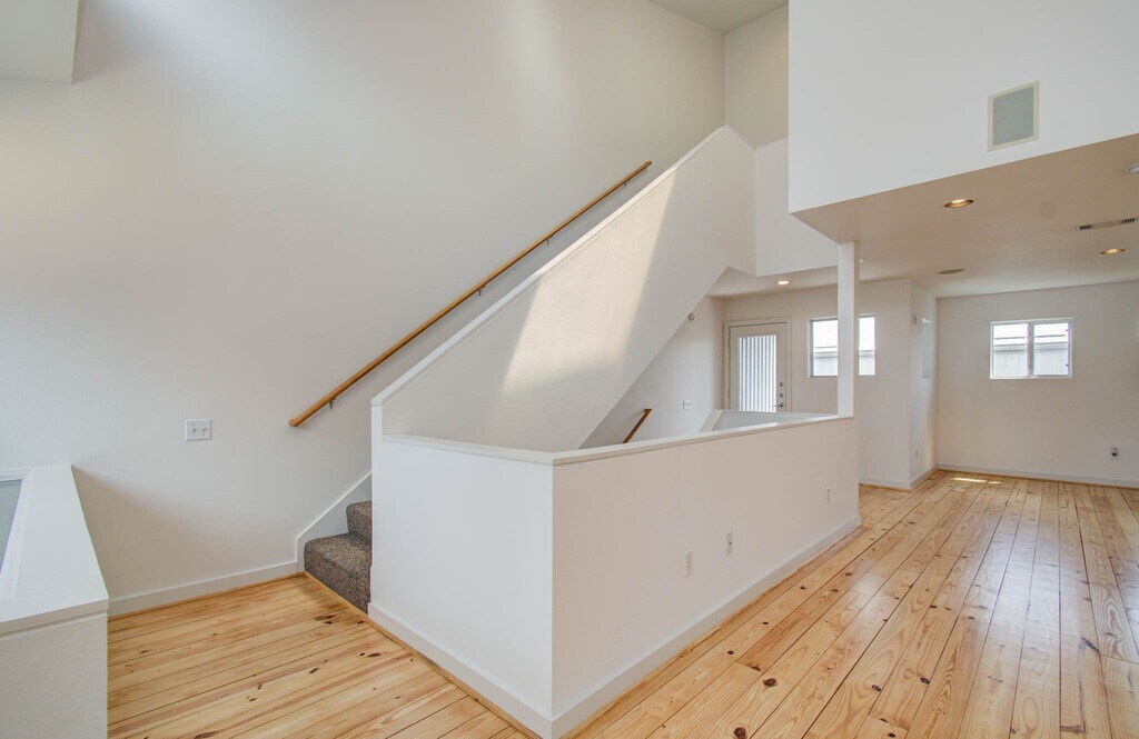 Gorgeous white and bright 3 story 2 bedroom 2 bathroom townhome in the Medical Center. So many windows give this house a ton of natural light. Amazing living room with soaring,high ceilings. Master bedroom looks out over living room down below. Master bedroom has a HUGE walk in closet. First floor has utility closet with washer/dryer (electric) connections,office,bedroom and bathroom. Open floor plan on the second floor,including a balcony,is perfect for entertaining. Newly re-finished hardwood floors are stunning in this home. Water and trash service included. Backyard is perfect for a sweet dog! MLS# 30432986