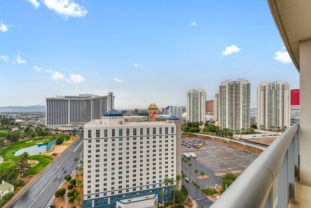 This spacious 1-bedroom, 1.5-bath residence offers an open-concept layout, flooding the interior with natural light and showcasing breathtaking vistas of the Las Vegas skyline and surrounding mountains. Designed with modern elegance, the unit features a gourmet kitchen with granite countertops, high-end stainless steel appliances, and custom cabinetry—perfect for entertaining or casual dining. The primary suite is a serene retreat, complete with a generous walk-in closet and a luxurious bathroom featuring marble finishes, vanity, and a soaking tub. Enjoy indoor-outdoor living with an expansive private terrace, ideal for morning coffee or evening cocktails. Residents of Turnberry Towers enjoy resort-style amenities including a lagoon-style pool with waterfalls, tennis courts, a fitness center, valet, concierge, and 24-hour security. Located just minutes from the Las Vegas Strip, world-class dining, shopping, and entertainment, this is high-rise living at its finest.