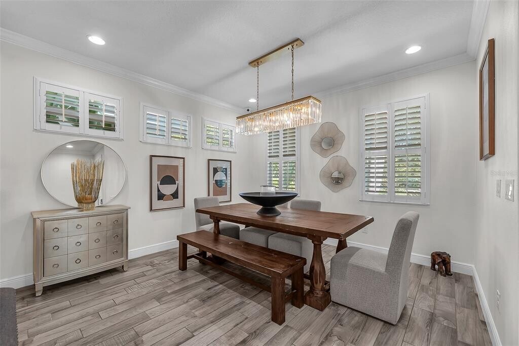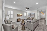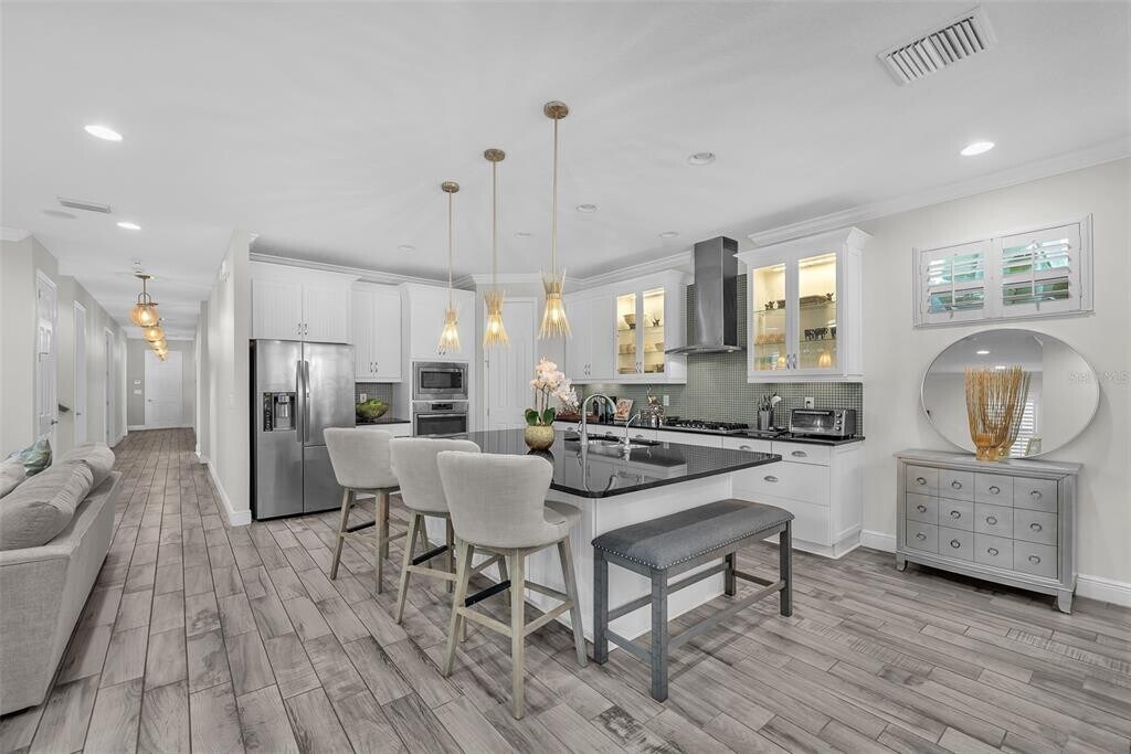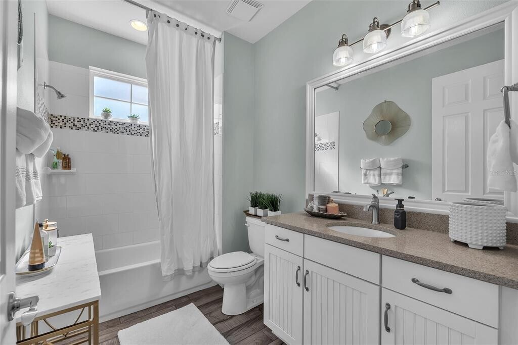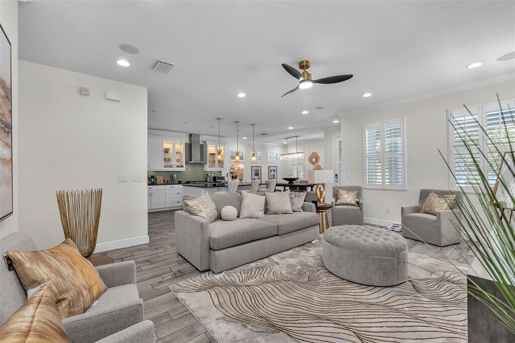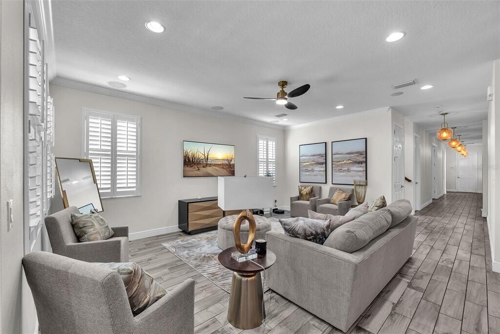 Live the Florida lifestyle in this beautifully furnished model home located in the gated resort-style community of MiraBay. Nestled on a premium,oversized lot in Bay Breeze,this custom-built home offers a tranquil,park-like setting with serene pond views you can enjoy from your spacious front patio. Step inside through a decorative leaded-glass 8 ft door to an open-concept floor plan designed for modern living. Every detail has been thoughtfully upgraded — from the rich crown molding and designer lighting to plantation shutters,wood-look ceramic tile flooring,and plush Berber carpet in the bedrooms. The gourmet kitchen is a chef’s dream,featuring 42” custom cabinetry,stainless steel appliances,stone countertops,gas cooktop,wall oven and microwave,sea-glass backsplash,and an oversized island that’s perfect for casual dining or entertaining. A cozy dining nook adds even more space for gatherings. The great room flows seamlessly from the kitchen and includes built-in surround sound — ideal for relaxing or movie nights. The primary suite on the main level provides a true retreat,complete with a sitting area,custom California Closet,and a spa-inspired ensuite boasting dual vanities,quartz countertops,and a custom walk-in shower. Also on the main level,you’ll find a private home office with French glass doors,a full guest bath,and a spacious laundry room. Upstairs offers a versatile loft/bonus area overlooking the pond and two generous secondary bedrooms with large closets and a shared bath — perfect for guests or family. Enjoy the best of Florida’s indoor-outdoor lifestyle on the screened lanai,ideal for morning coffee,evening dining,or simply soaking in the sunset views. Your rental includes landscaping,irrigation,and interior water and MiraBay’s resort-style amenities including: Lagoon-style heated pool,Fitness center and spa,On-site café and social clubhouse,Tennis,basketball,and pickleball courts,Playgrounds and scenic walking trails. Conveniently located near shopping,dining,major highways,and Florida’s beaches and theme parks,this stunning property offers the perfect blend of comfort,style,and convenience. Come enjoy coastal living at its best — Welcome Home! There is a one time $125 Tenant Processing Fee due at move in along with rent and deposit. There is a monthly fee of $500 for furnishings. Schedule your private tour today!