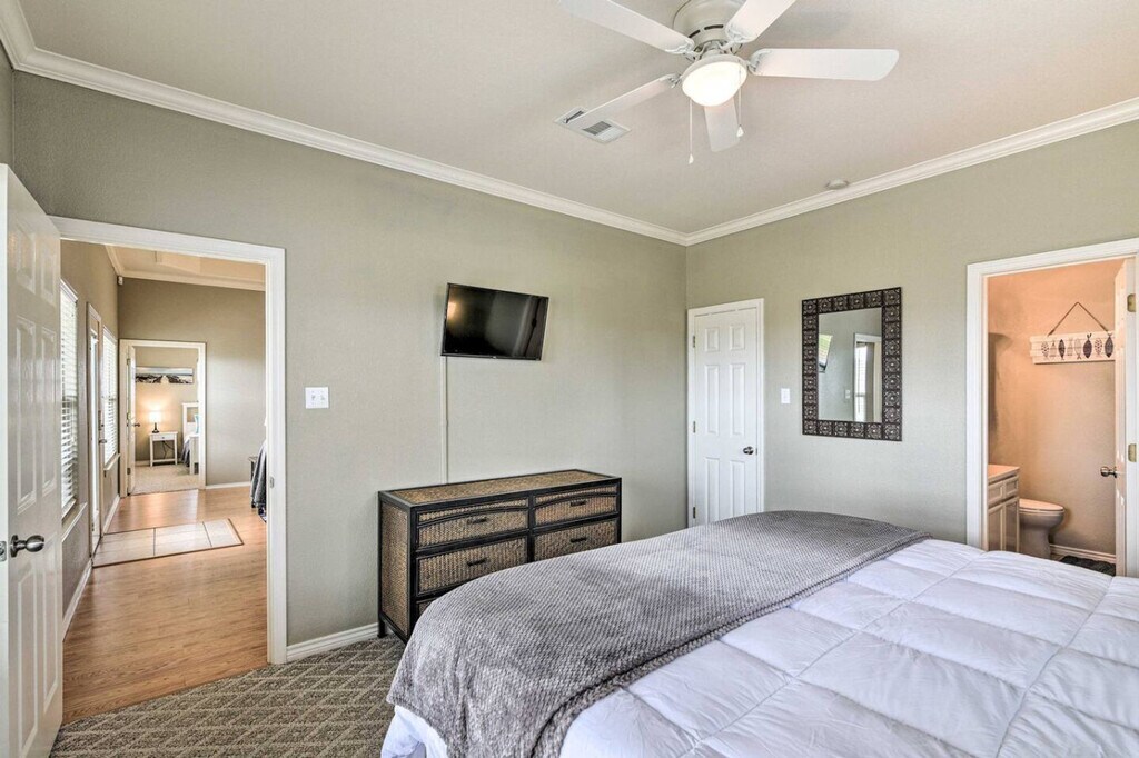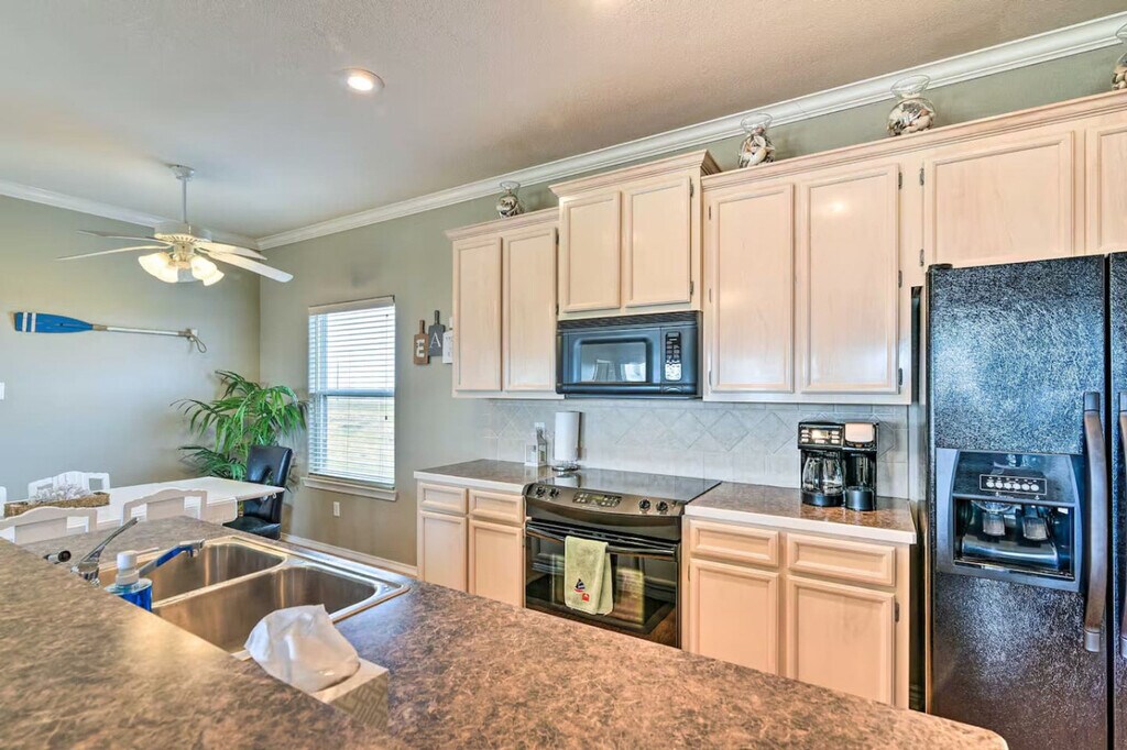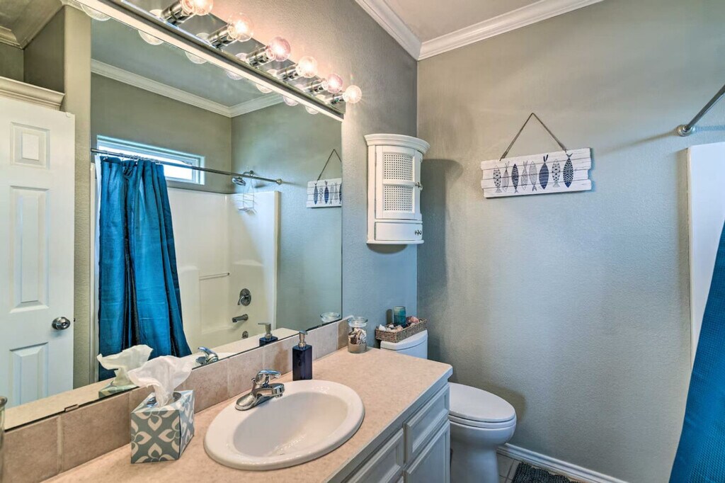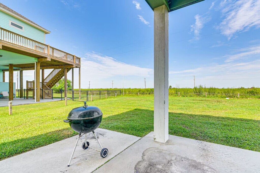 Feel at home in this 3-bedroom, 2-bath beach house in the heart of Crystal Beach, on the Bolivar Peninsula. Here, the sand runs wide and flat, and the days are simple: beach, sun, good food, and sleep. Inside, this home is built for people to be together. The living room is open and bright and features an electric fireplace that throws a soft glow on cool nights, with a big sofa. The kitchen opens to the room, so whoever is cooking is still part of the talk. Outside, there is space to sit, eat, and watch the light change. A partially covered deck works for morning coffee when the air is still cool or for a last drink when the stars come out. Below, you’ll find outdoor seating, a dining area, and a grill, so suppers can be cooked and eaten in the open air. Down in the garage hangout, there is a propane fire pit, chairs pulled around it, and room for a cooler with a few outdoor games. You can drive your own car or truck right onto most stretches of the beach with a Bolivar Beach parking sticker, then park by the water and set up for the day. The house sits in a quiet pocket near the center of Crystal Beach. The streets are simple and low, with houses on pilings and the Gulf out in front of it all. You hear the surf on still nights. In the morning, you can be on the sand in a short walk or a quick golf cart ride, driving along the wide, open beach the peninsula is known for. Around you is an easy-going beach town where people move slow. At night the neighborhood is mostly quiet. You sit on the deck and see porch lights, a few carts heading home, and the dark line of the Gulf beyond. The house sleeps 8 people. Any extra guests must be cleared before booking. Only registered guests may stay. Visitors need approval first. Do not park under the house. Use the driveway only and take care not to hit the pilings. If a key is lost, or you are locked out after all normal access options have been tried, you will be responsible for any locksmith or re-key fees (call-out, labor, parts, after-hours charges). If the problem is caused by a bad lock or by a mistake, it will be covered. Do not leave food sitting out. It brings pests. Keep the house reasonably clean as you go. It makes check-out simpler for everyone. If something is damaged by accident, it should be reported as soon as possible. Keep noise down at night so neighbors can rest. Do not move the furniture, inside or out. Grill only downstairs on the patio, never on the deck. Please clean the grill after you use it. Rinse sand off with the shower downstairs and leave sandy shoes at the door or on the deck by the entrance. Do not flush feminine products or anything that could harm the septic system. Do not pour grease down any drain. Lock all doors when you leave the house. If guests are asked to leave because of rule-breaking or reckless behavior, there will be no refunds. In a mandatory hurricane evacuation, you will receive a full refund or a credit for any unused nights. We are not responsible for accidents, injuries, or lost or stolen items during your stay. By booking, you accept responsibility for your own safety and for the safety of any guests you bring. There are no lifeguards on Crystal Beach. You swim at your own risk. If something breaks and the damage comes from careless behavior, the cost may fall to you. A hold of $200 is placed on your card before you arrive. After you book, you’ll get a secure link to enter your card details. The hold is set 3 days before check-out and released 4 days after check-out, as long as there is no damage to the house. [SI]